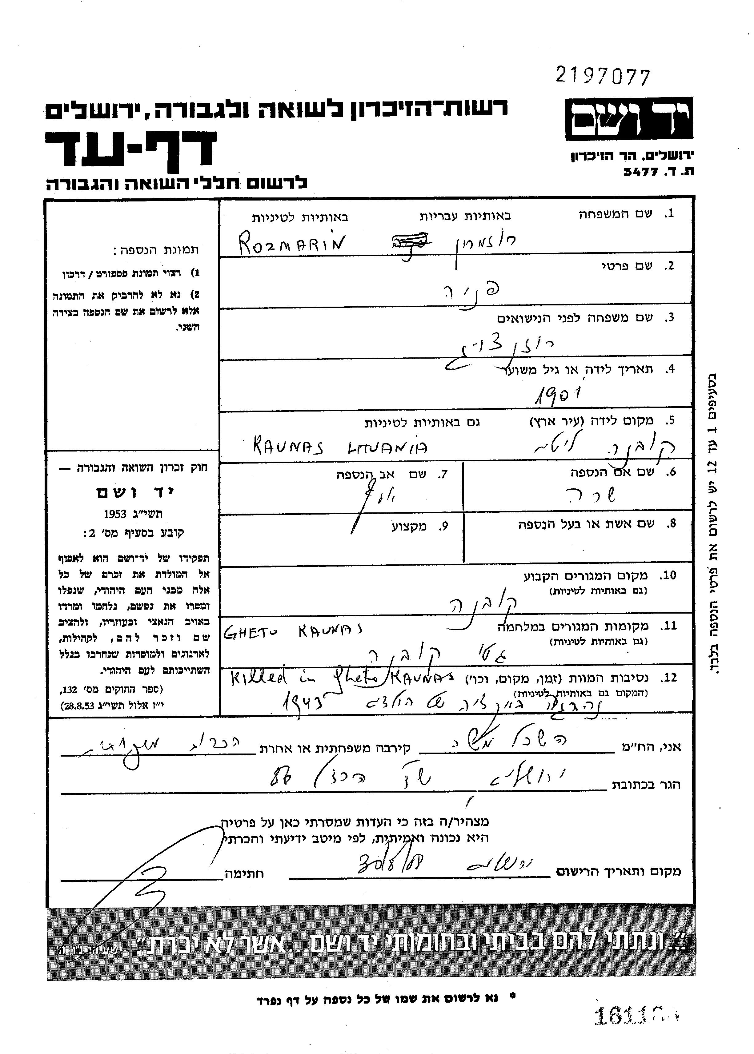 Rozmarin Fanya 1901 Kaunas, Lituanie Feuille de témoignage
