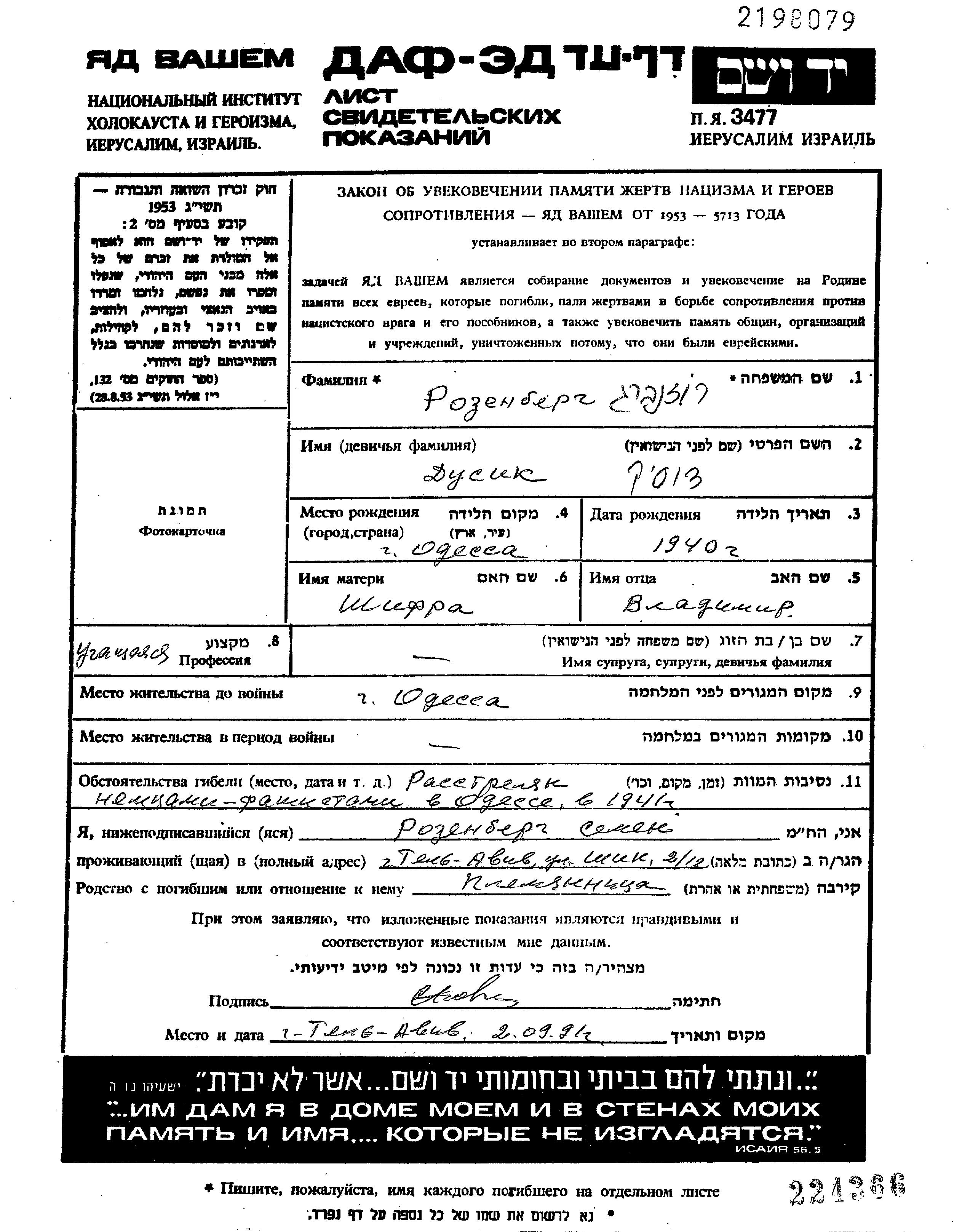 Rozenberg Dusik Dusia 1940 Odessa, Ukraine (URSS) Feuille de témoignage
