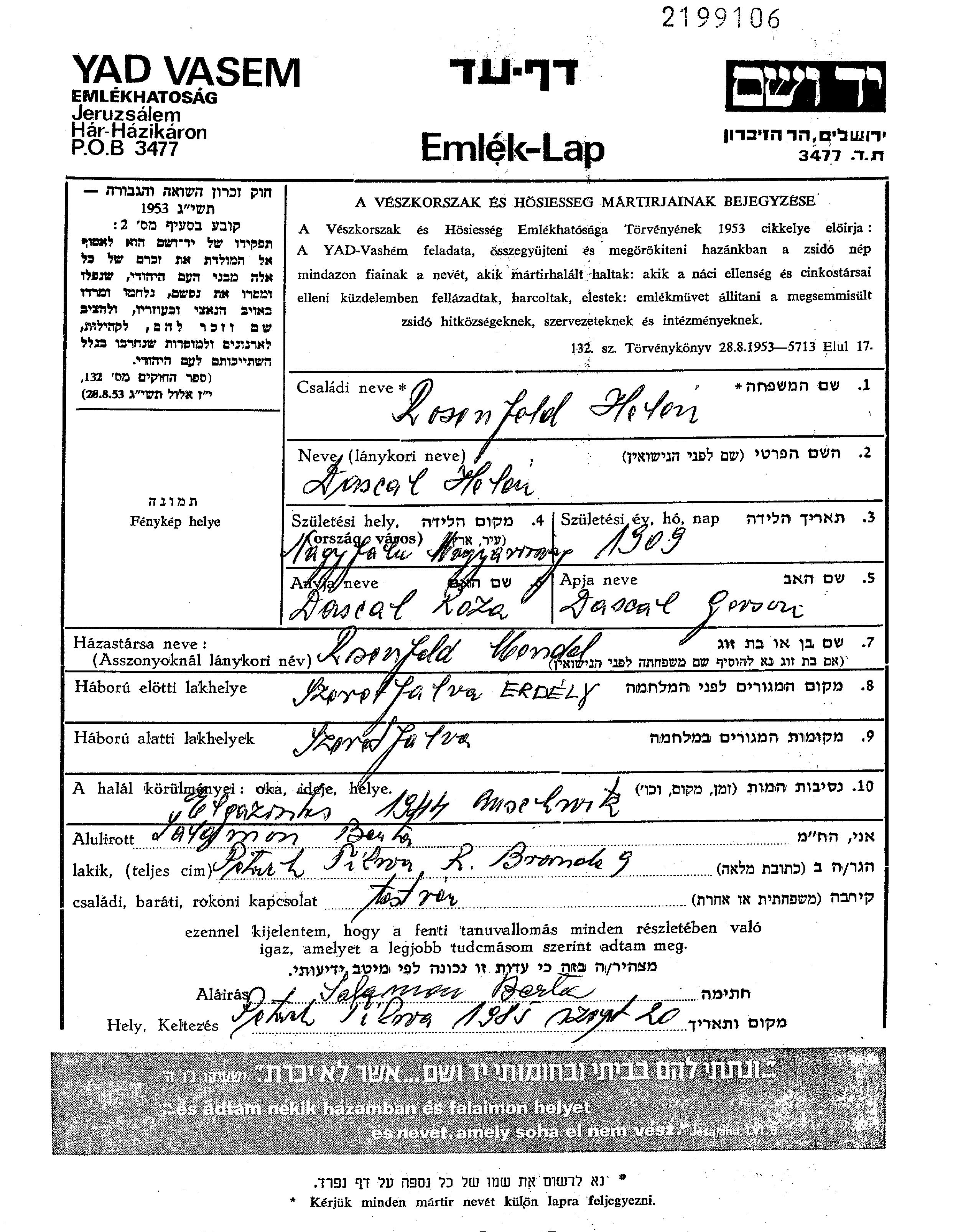 Rosenfeld Helen 1909 Szerfalva, Roumanie Feuille de témoignage