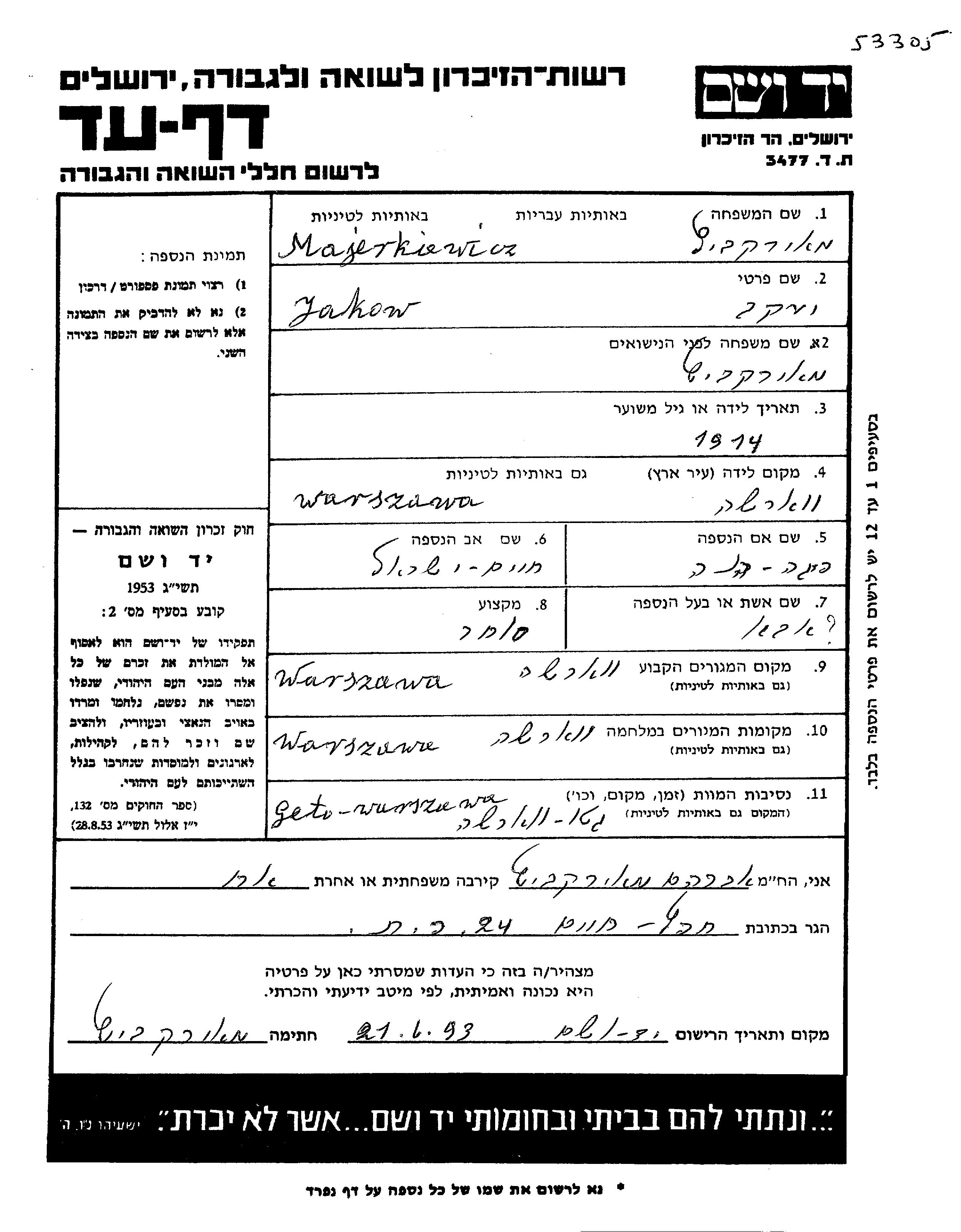 Majerkiewicz Yakov 1914 Warszawa, Pologne Feuille de témoignage