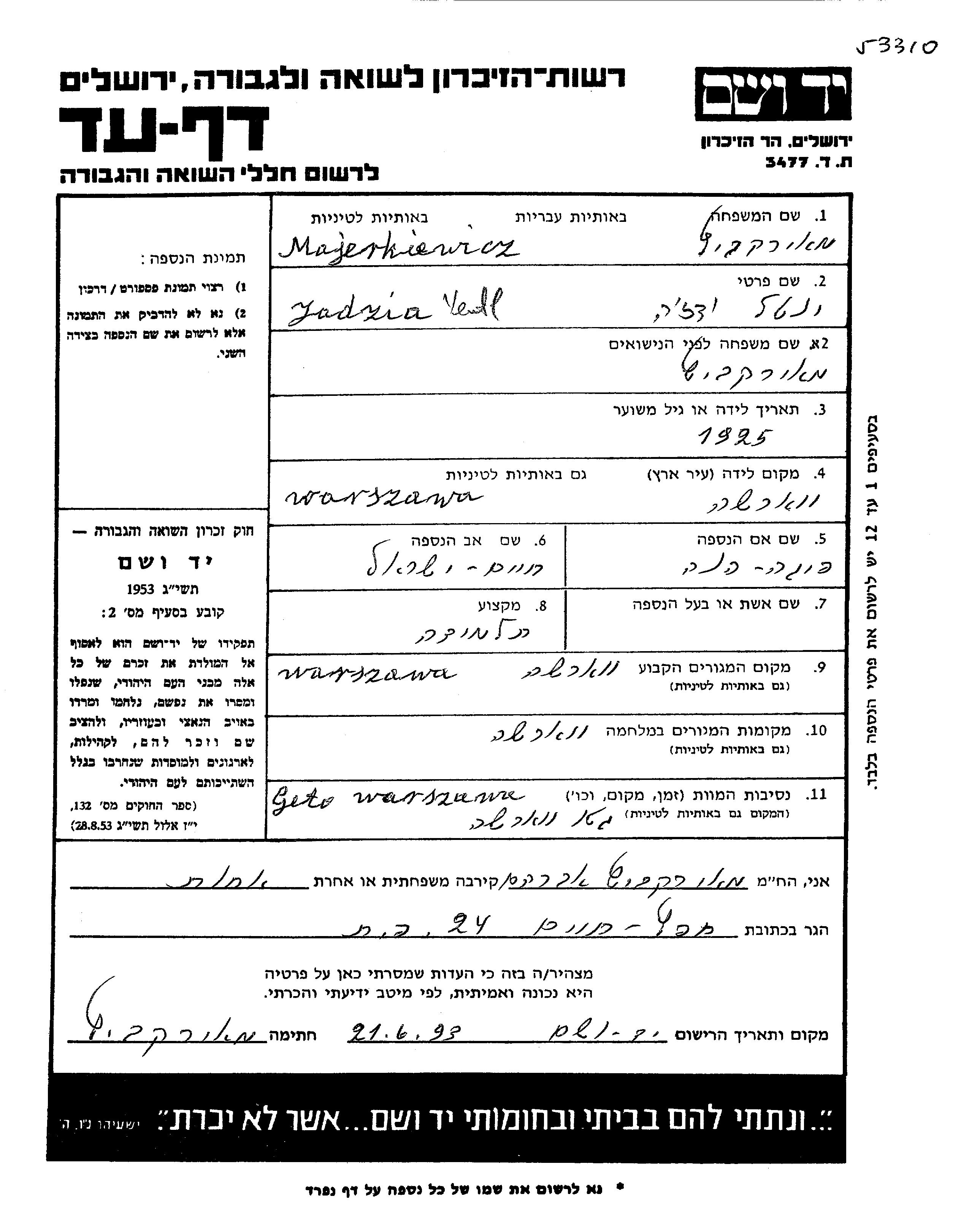 Majerkiewicz Jadzia Yentl 1925 Warszawa, Pologne Feuille de témoignage