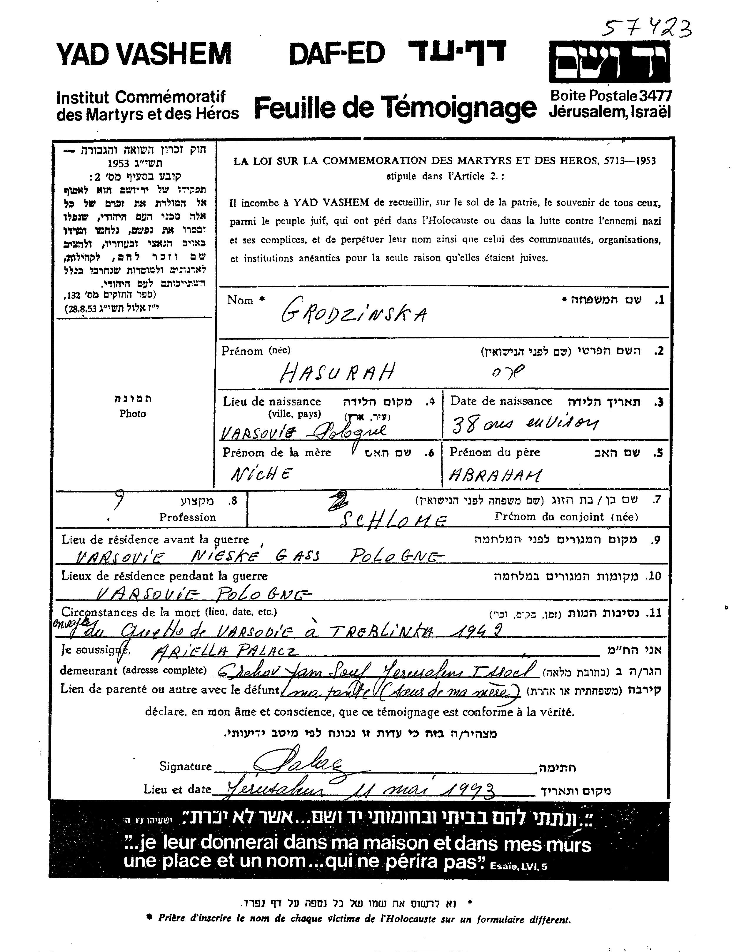 Grodzinski Hasurah Sara Warszawa, Pologne Feuille de témoignage