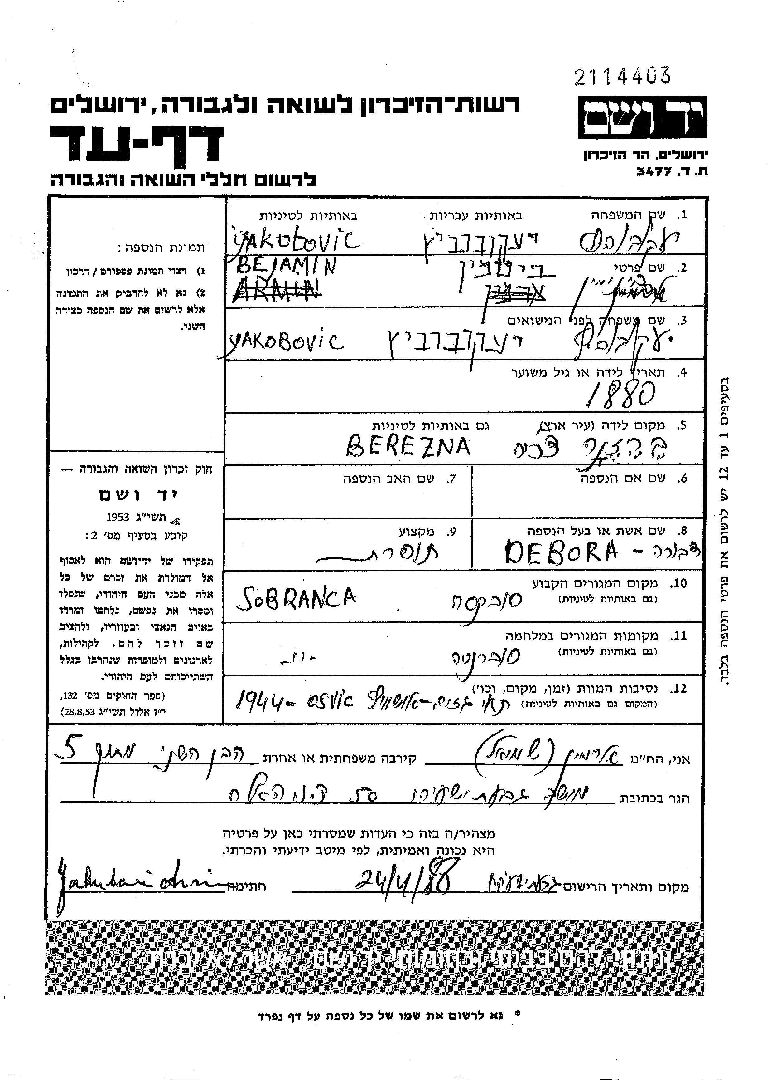 Yakobovic Bejamin Sobrance, Tchécoslovaquie Feuille de témoignage