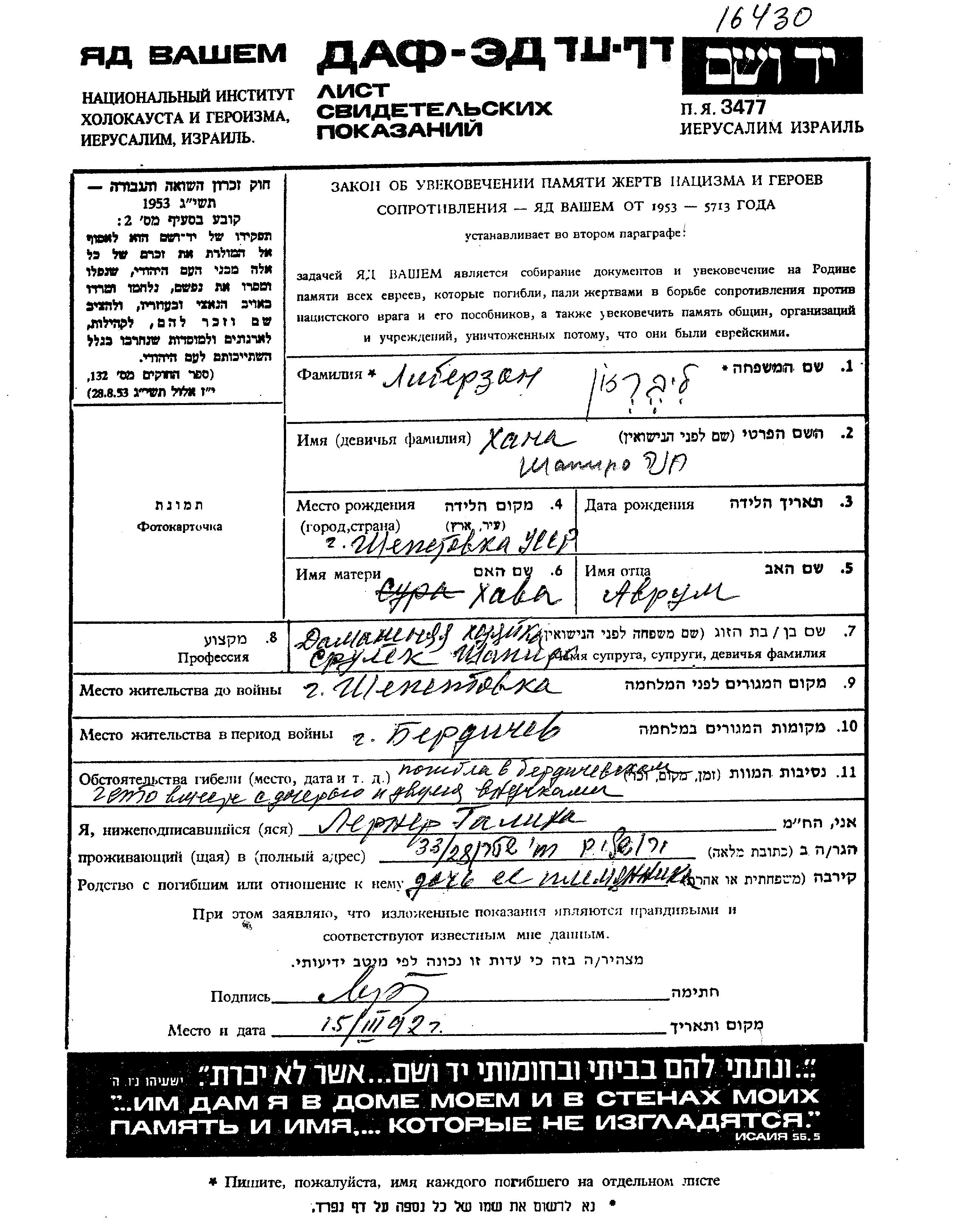 Liberzon Khana Shepetovka, Ukraine (URSS) Feuille de témoignage