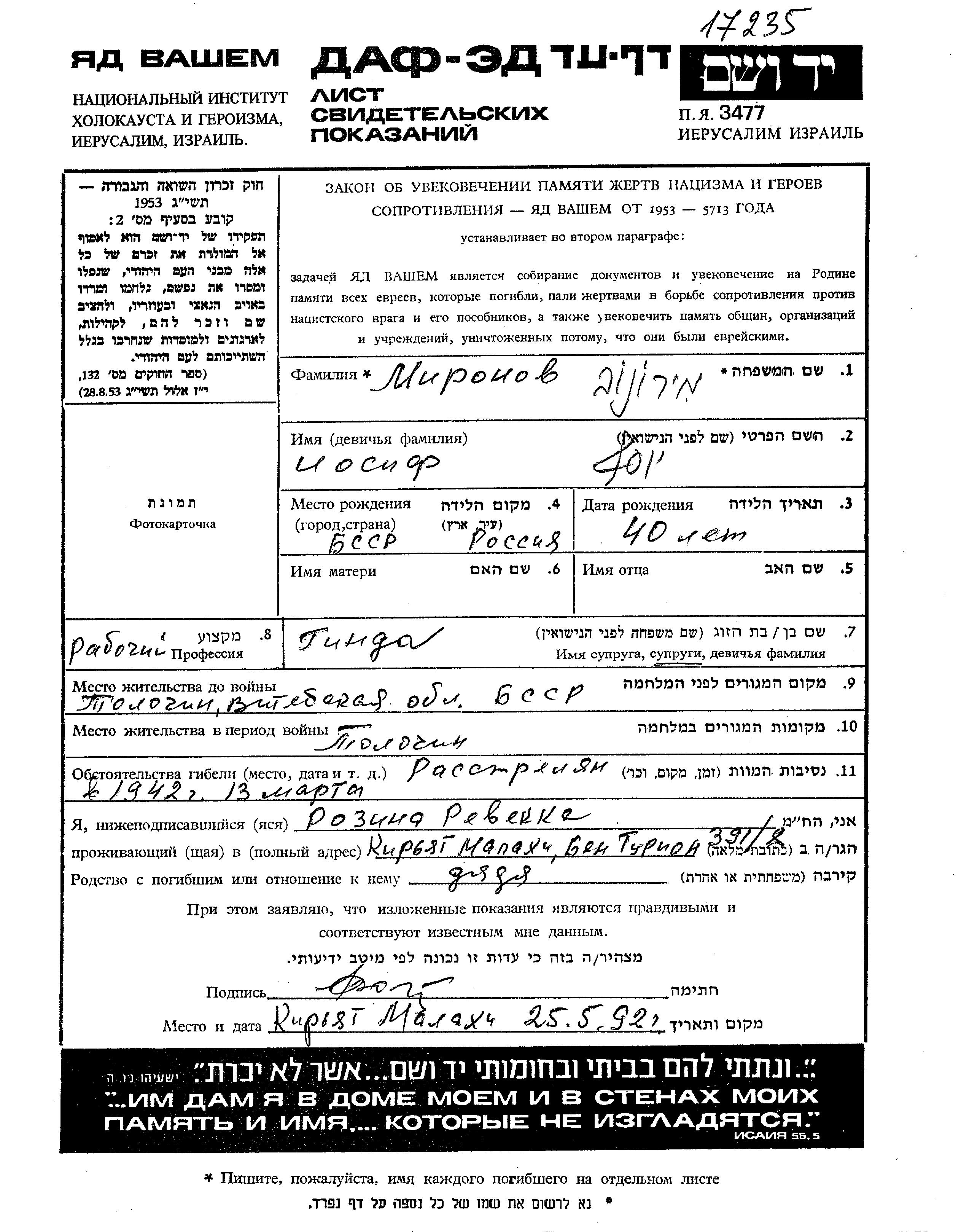 Mironov Iosif Tolochin, Bélorussie (URSS) Feuille de témoignage