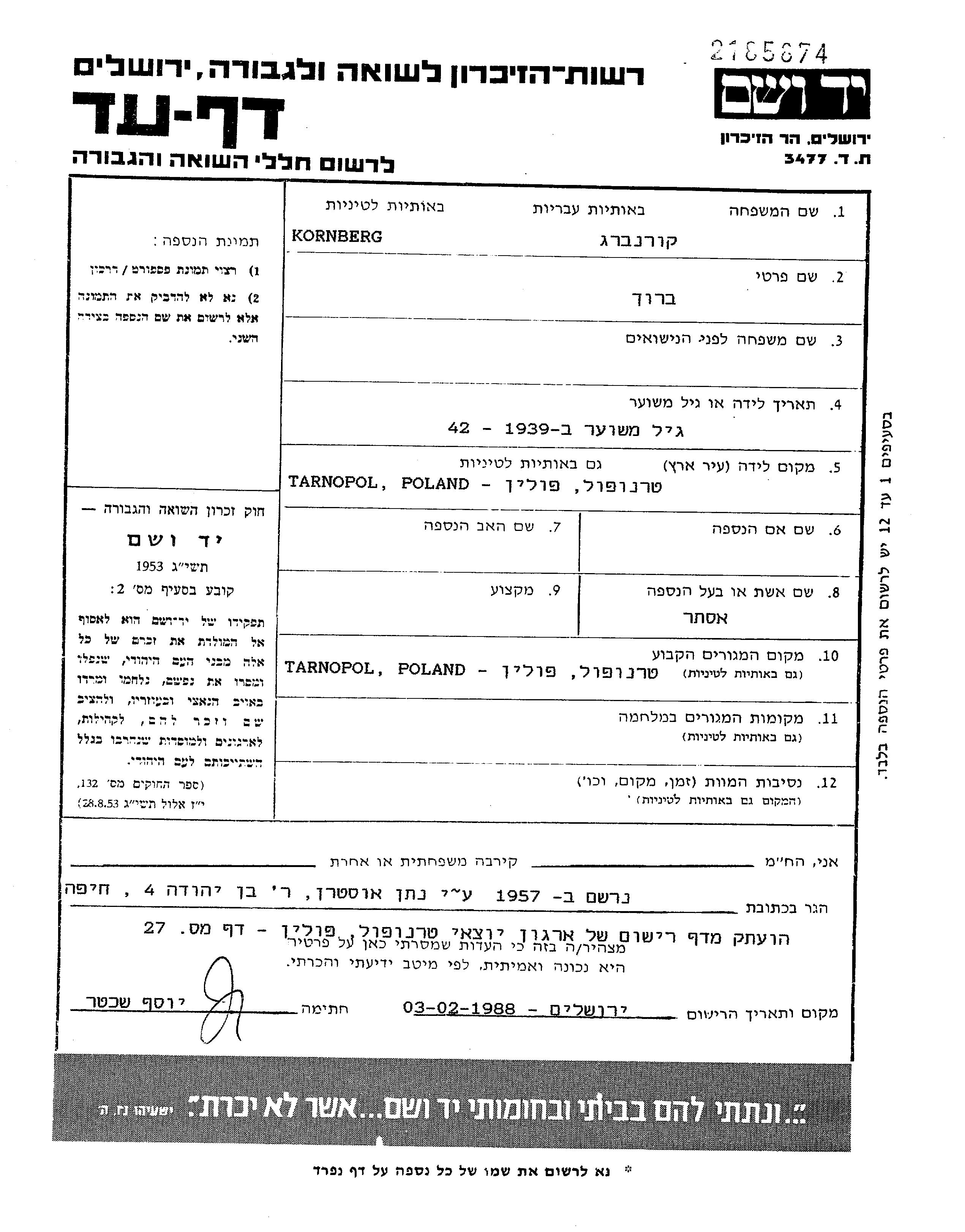 Kornberg Barukh 1897 Tarnopol, Pologne Feuille de témoignage