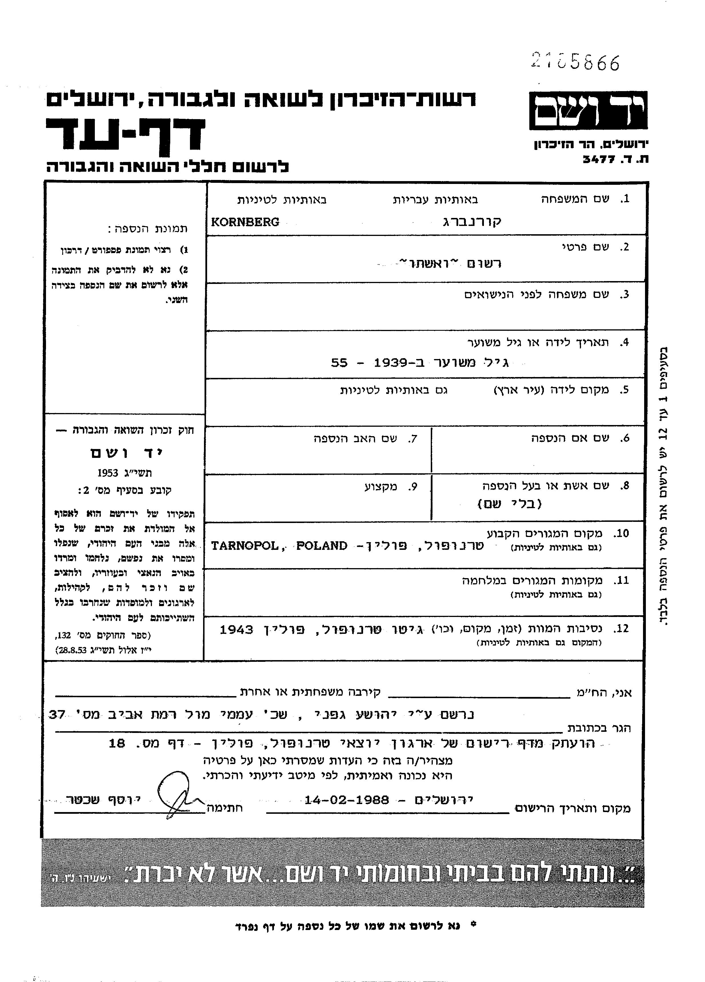 Kornberg prénom inconnu 1884 Tarnopol, Pologne Feuille de témoignage