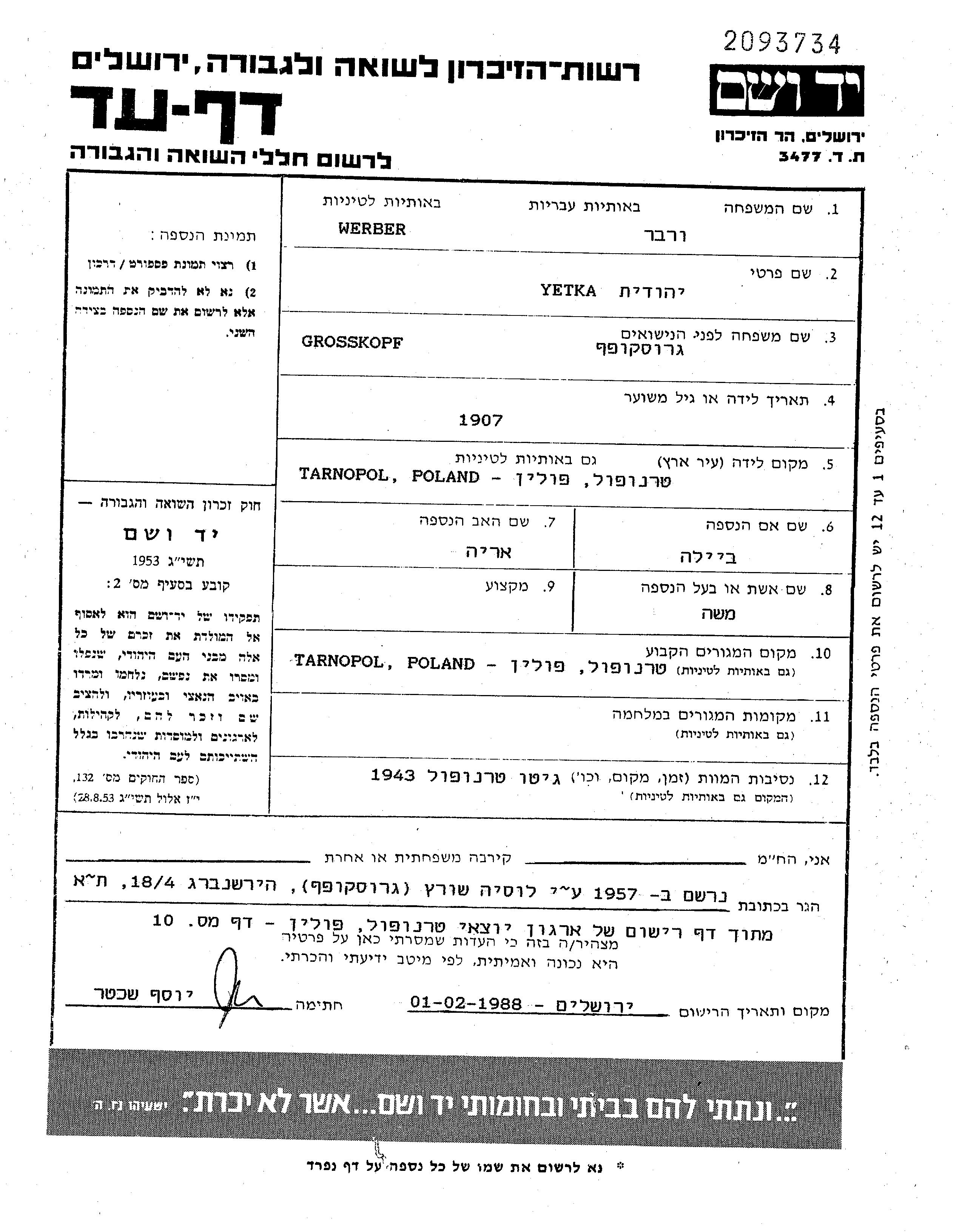 Yetka Werber née Grosskopf est née à Tarnopol, Pologne, fille de Arie et de Beila. Elle était Mariée à Moshe. Avant la seconde guerre mondiale elle vivait à Tarnopol, Pologne. Pendant la guerre, elle était à Tarnopol, Pologne.
