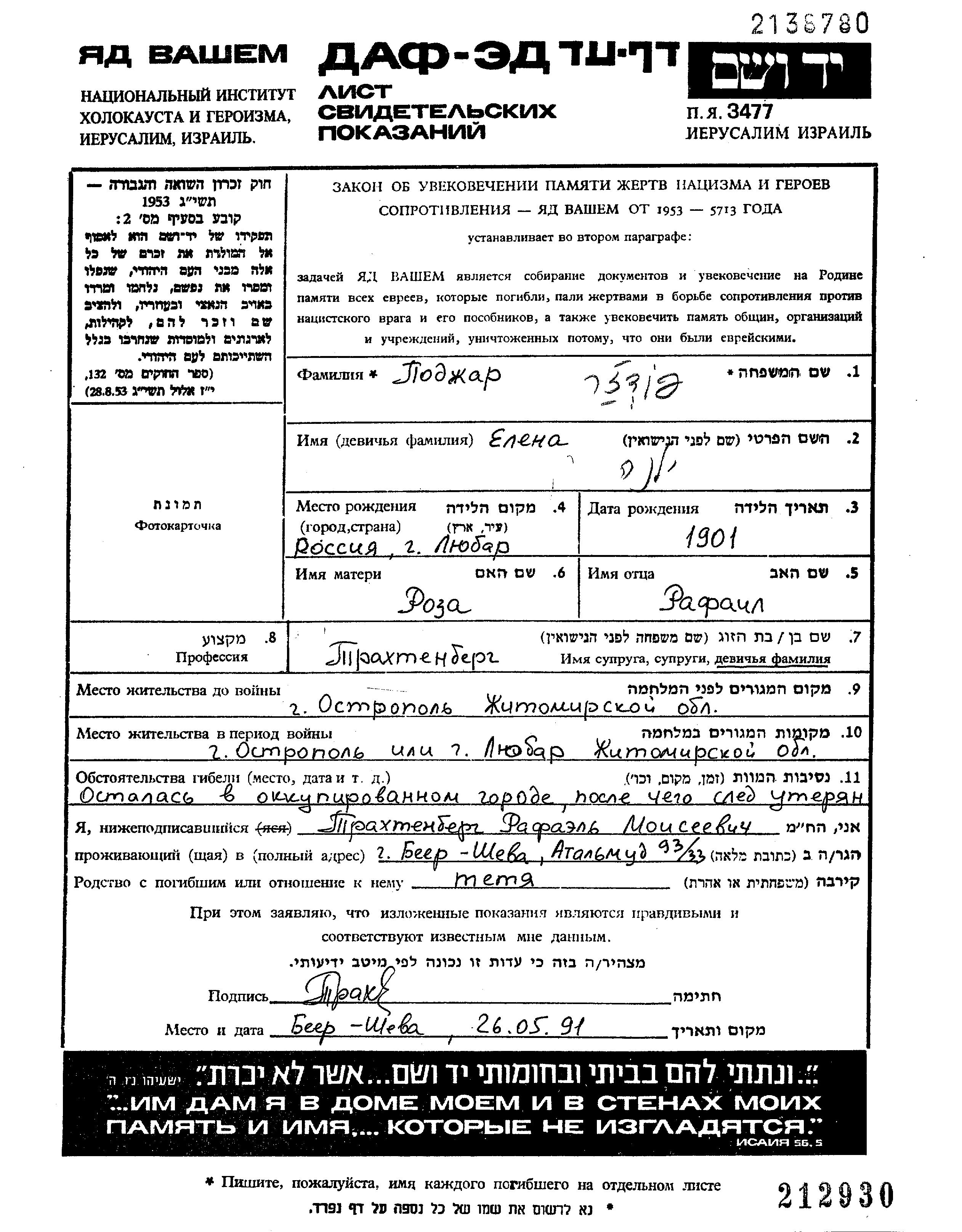 Yelena Podzhar née Trakhtenberg est née à Lyubar, Ukraine (URSS), fille de Rafael et de Roza. Elle était Mariée à Iosif. Avant la seconde guerre mondiale elle vivait à Ostropol, Ukraine (URSS). Pendant la guerre, elle était à Lyubar, Ukraine (URSS).