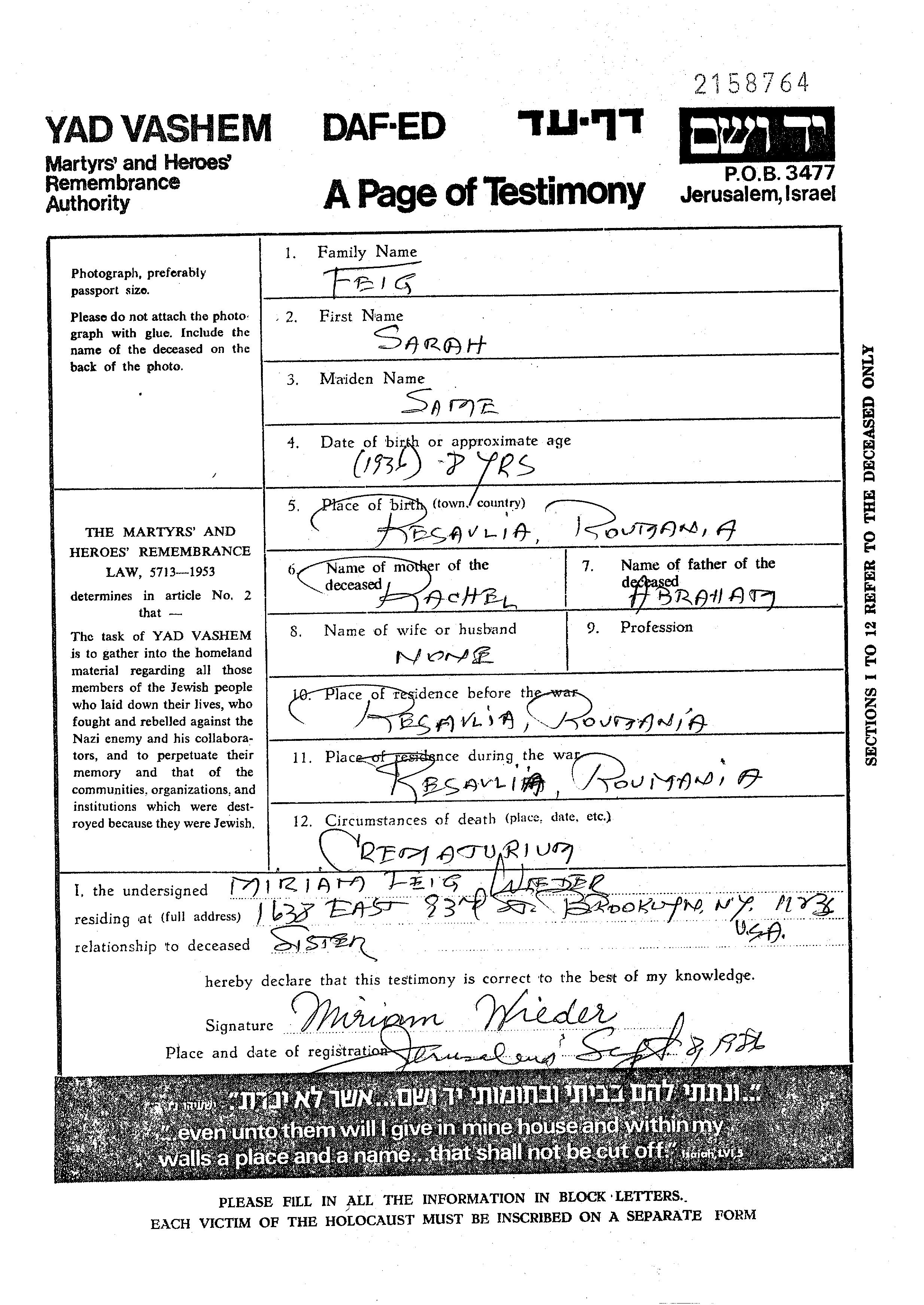 Feig Sarah 1936 Rozavlea, Roumanie Feuille de témoignage