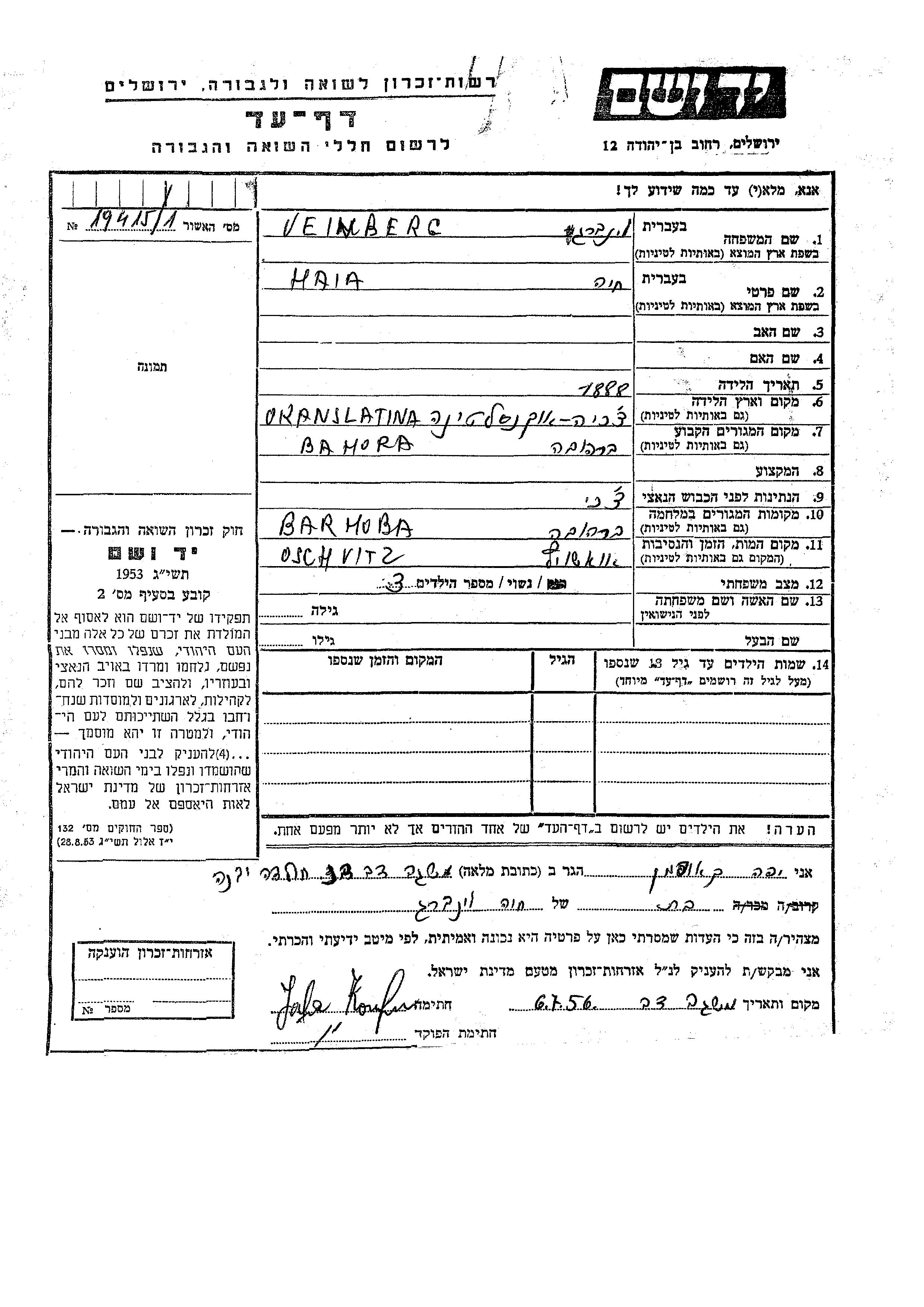 Veinberg Haia 1888 Berehovo, Tchécoslovaquie Feuille de témoignage