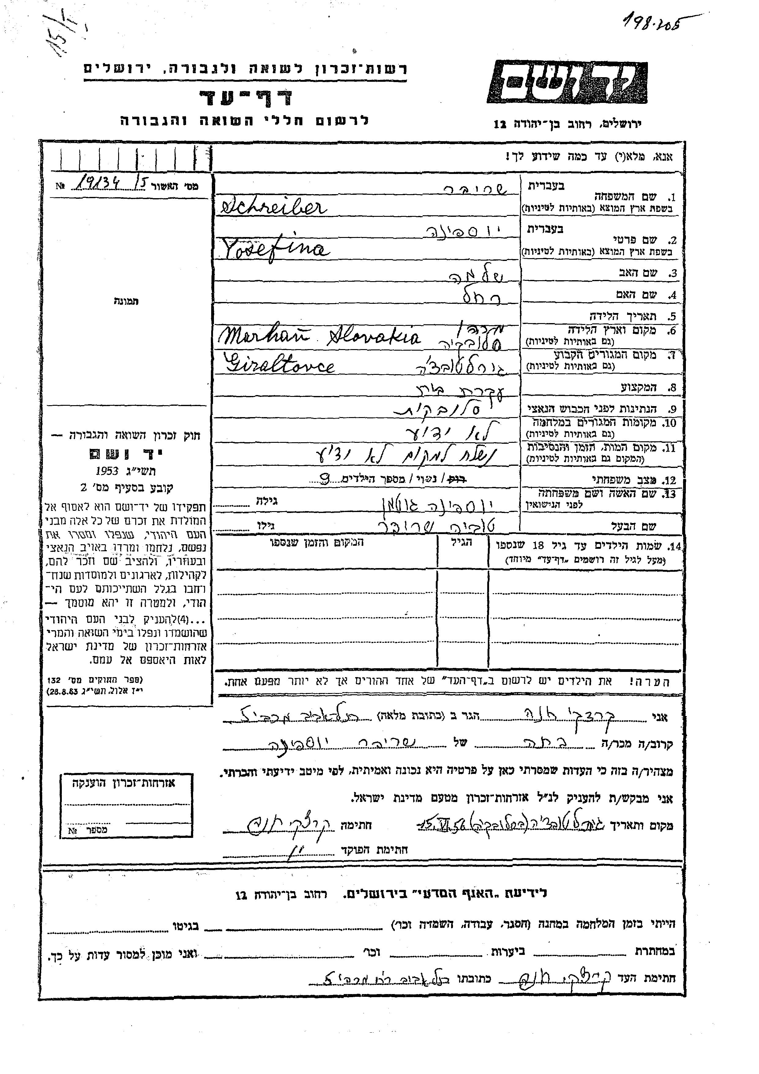 Schreiber Yosefina Giraltovce, Tchécoslovaquie Feuille de témoignage