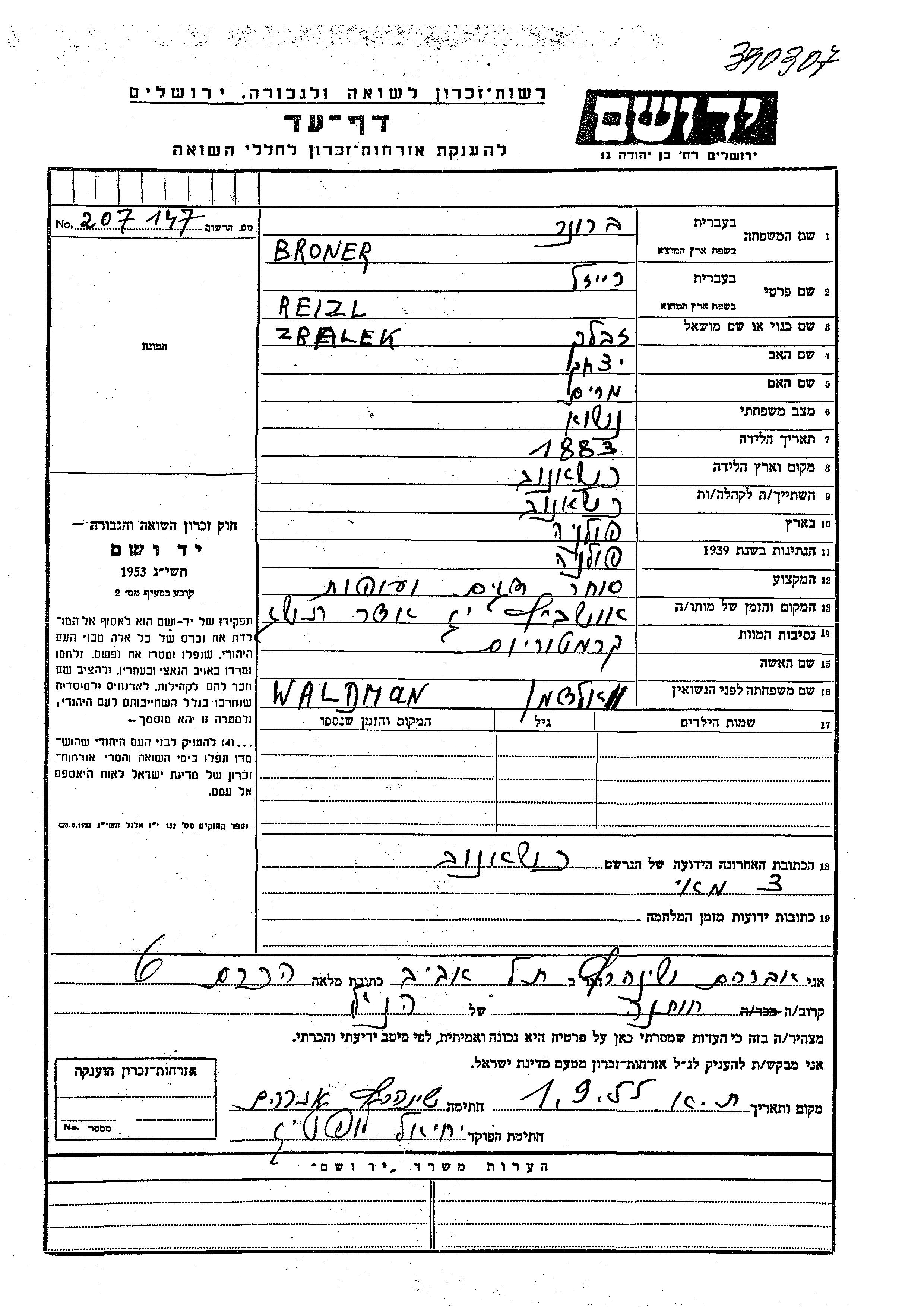 Reizl Broner née Waldman est née à Kszanov, Pologne en 1883, fille de Yitzkhak et de Miriam. Elle était סוחרת דגים ועופות et Mariée. Avant la seconde guerre mondiale elle vivait à Kszanov, Pologne. Pendant la guerre, elle était à Kszanov, Pologne.