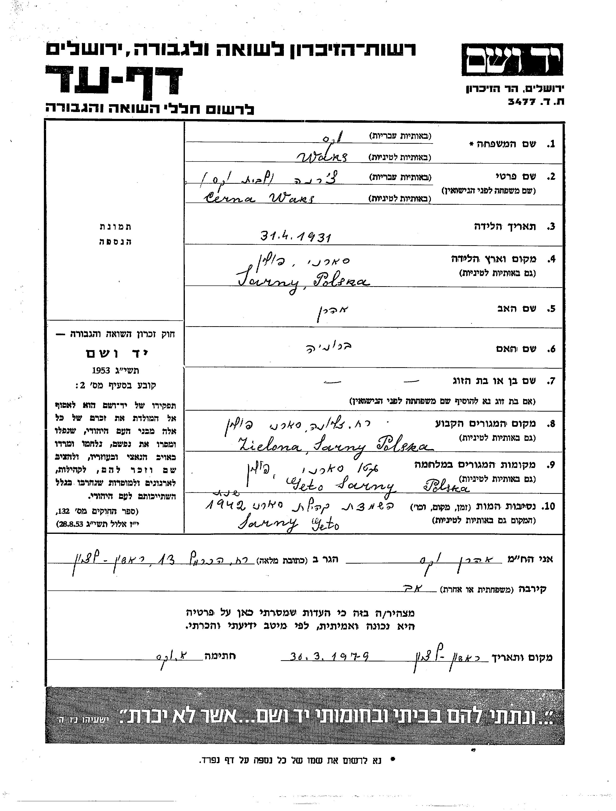 Waks Cerna 1931 Sarny, Pologne Feuille de témoignage