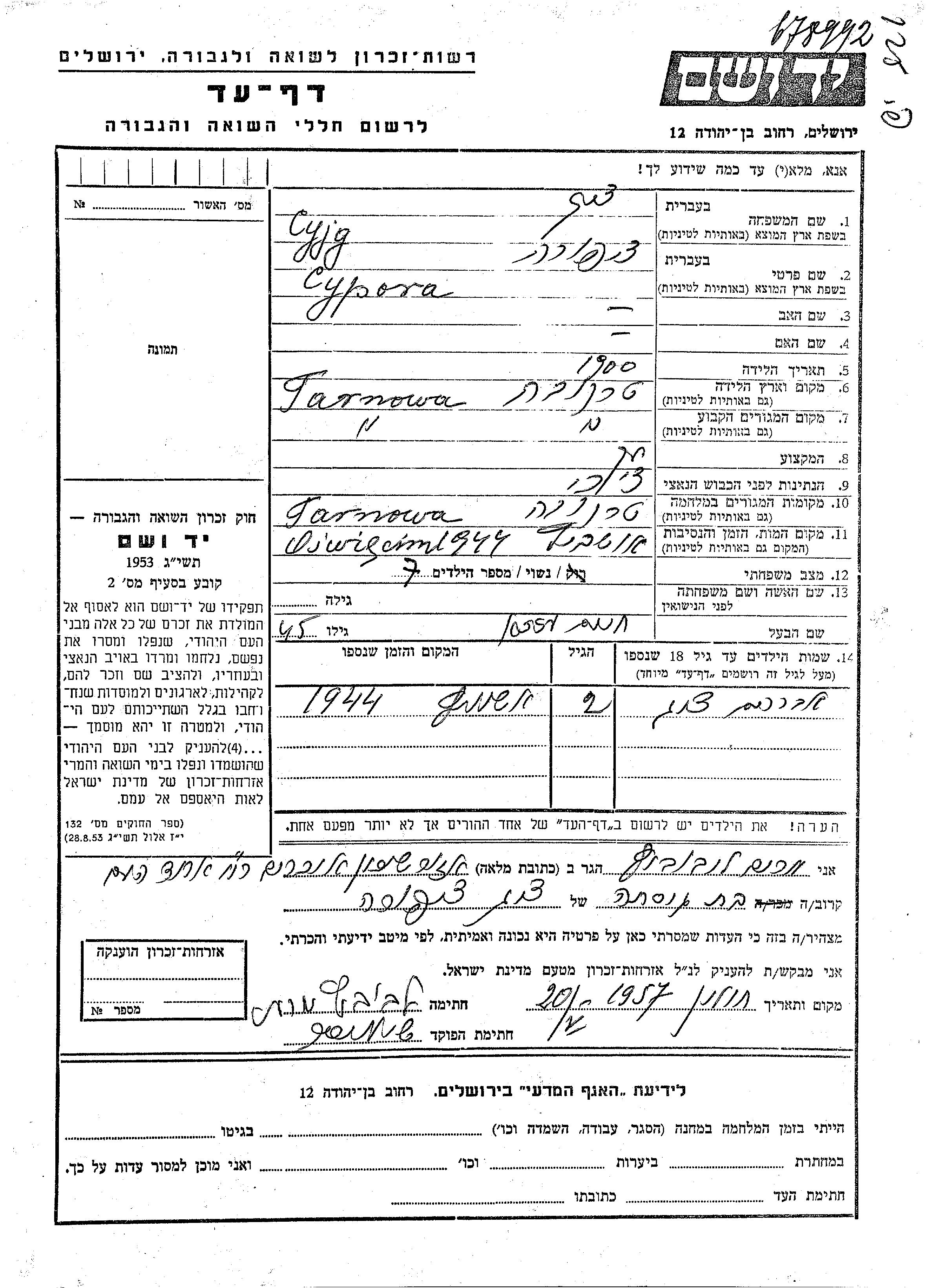 Cypora a été assassinée pendant la Shoah. Lieu de la mort: Auschwitz, Pologne en 1944.