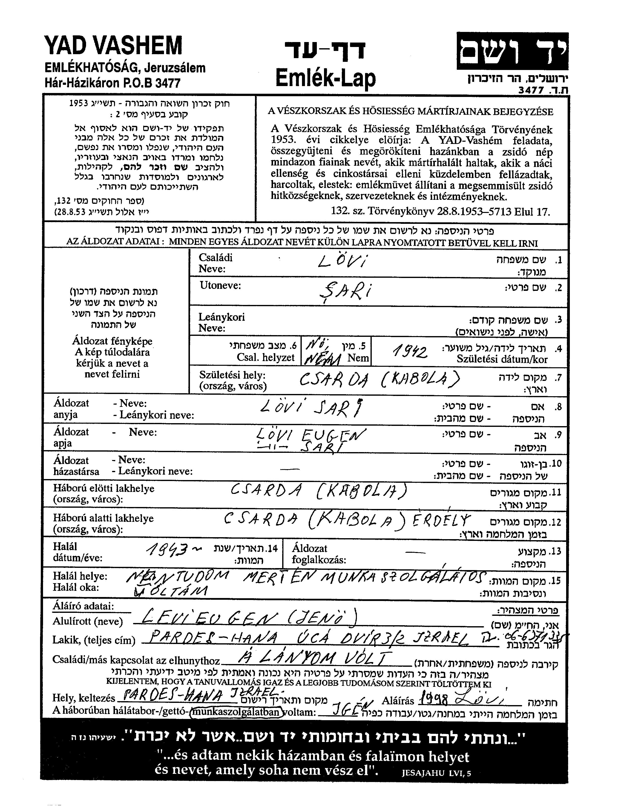 Sari Lovi est née à Csarda, Hongrie en 1942, fille de Eugen et de Sari. Avant la seconde guerre mondiale elle vivait à Csarda, Hongrie. Pendant la guerre, elle était à Csarda, Hongrie.