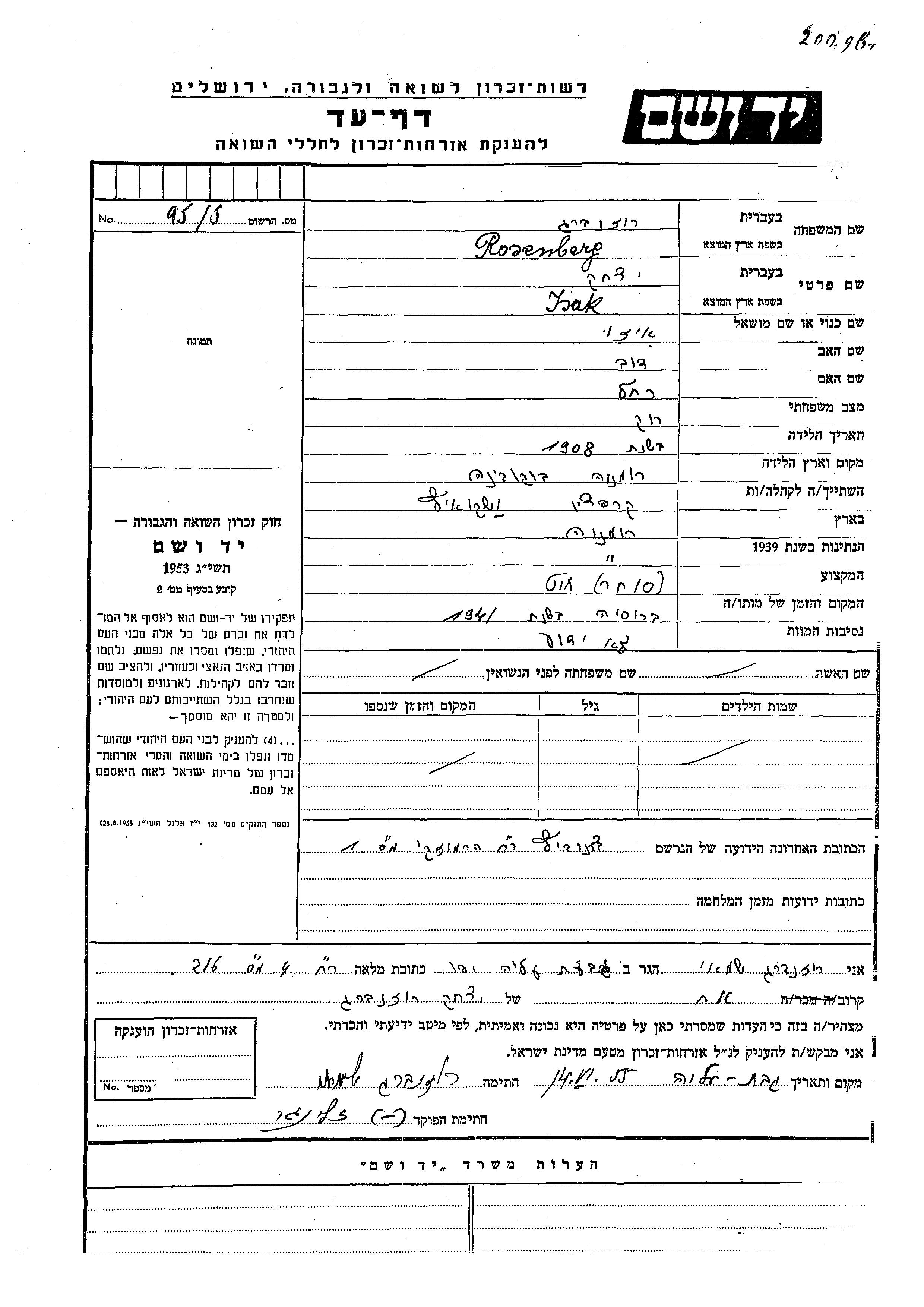 Rosenberg Yitzkhak Izo 1908 endroit inconnu, Feuille de témoignage