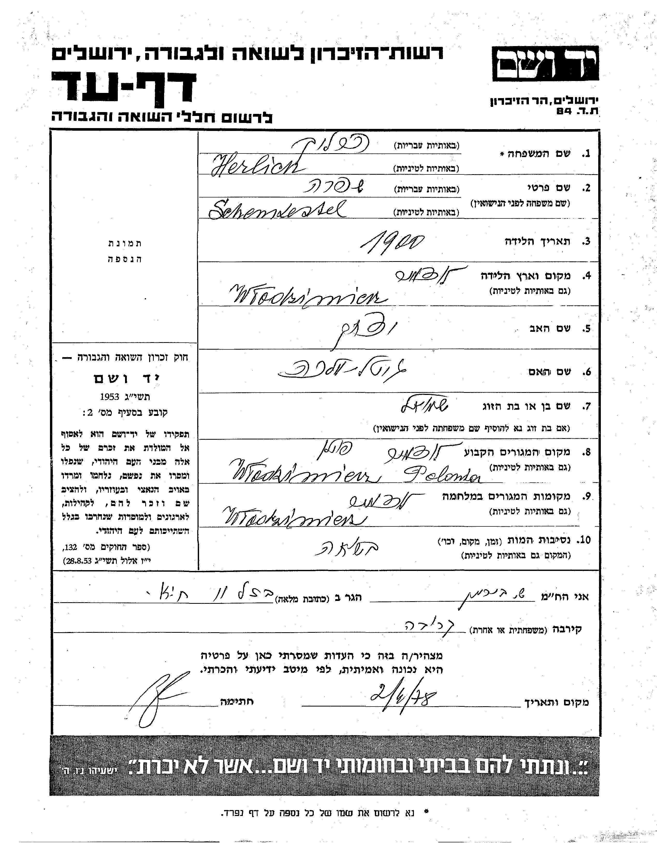 Herlich Shifra 1900 Wlodmer, Pologne Feuille de témoignage