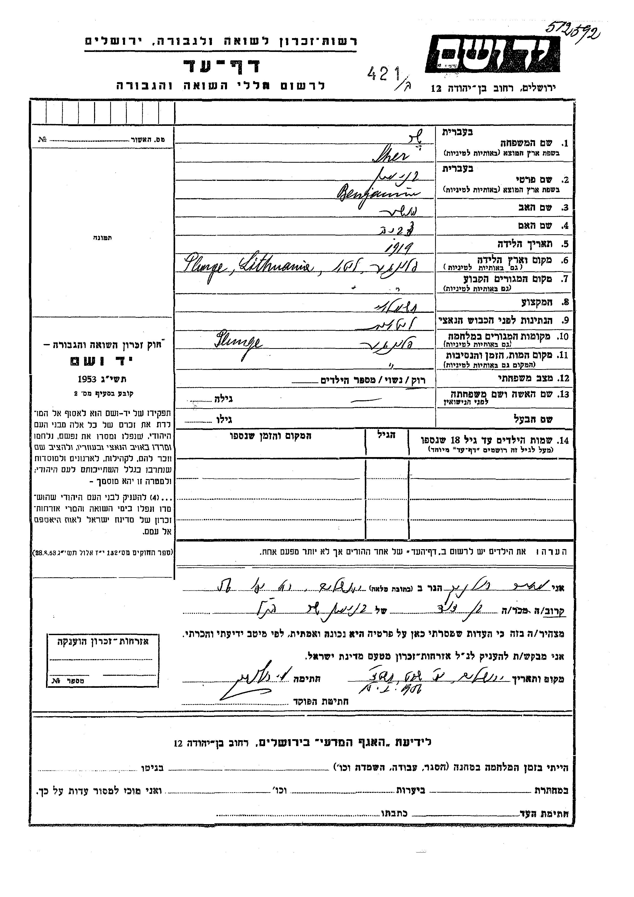Sher Benjamin 1919 Plungė, Lituanie Feuille de témoignage