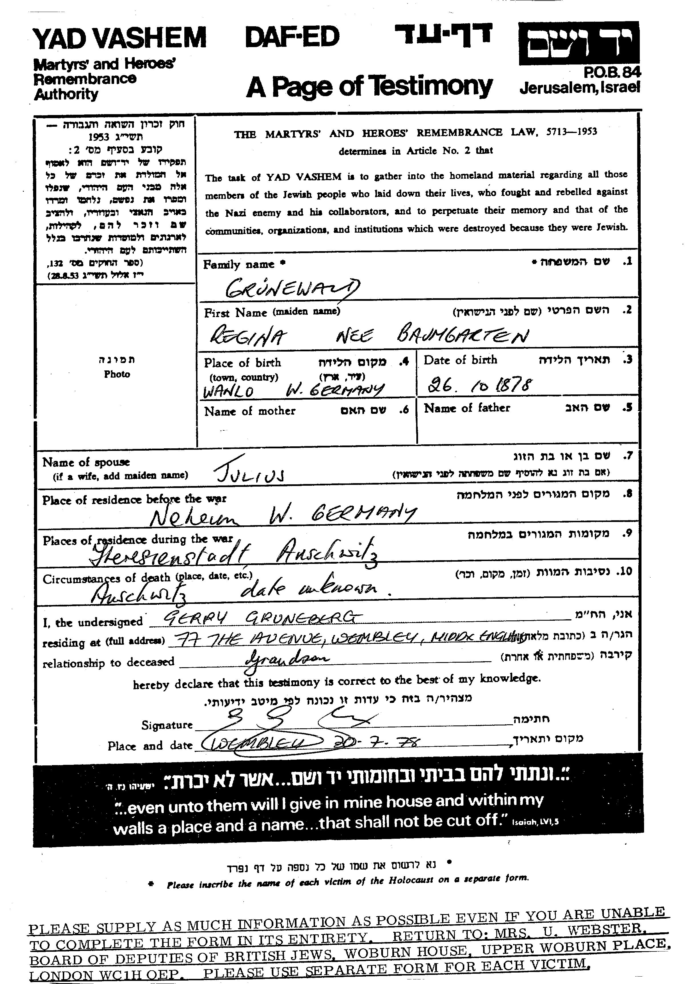 Regina Gruenewald née Baumgarten est née à Wanlo, Allemagne en 1878. Elle était Mariée à Julius. Avant la seconde guerre mondiale elle vivait à Neheim, Allemagne. Pendant la guerre, elle était à Auschwitz, Pologne.