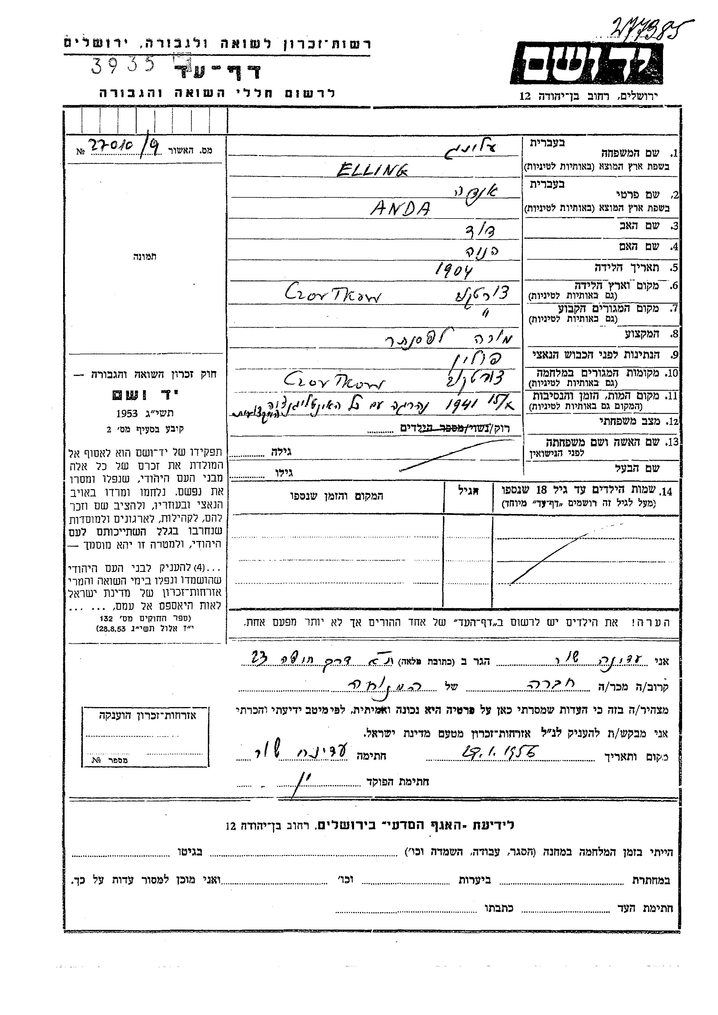 Anda Elling est née à Czortkow, Pologne en 1904, fille de David et de Henia. Elle était Professeur de piano et Célibataire. Pendant la guerre, elle était à Czortkow, Pologne.