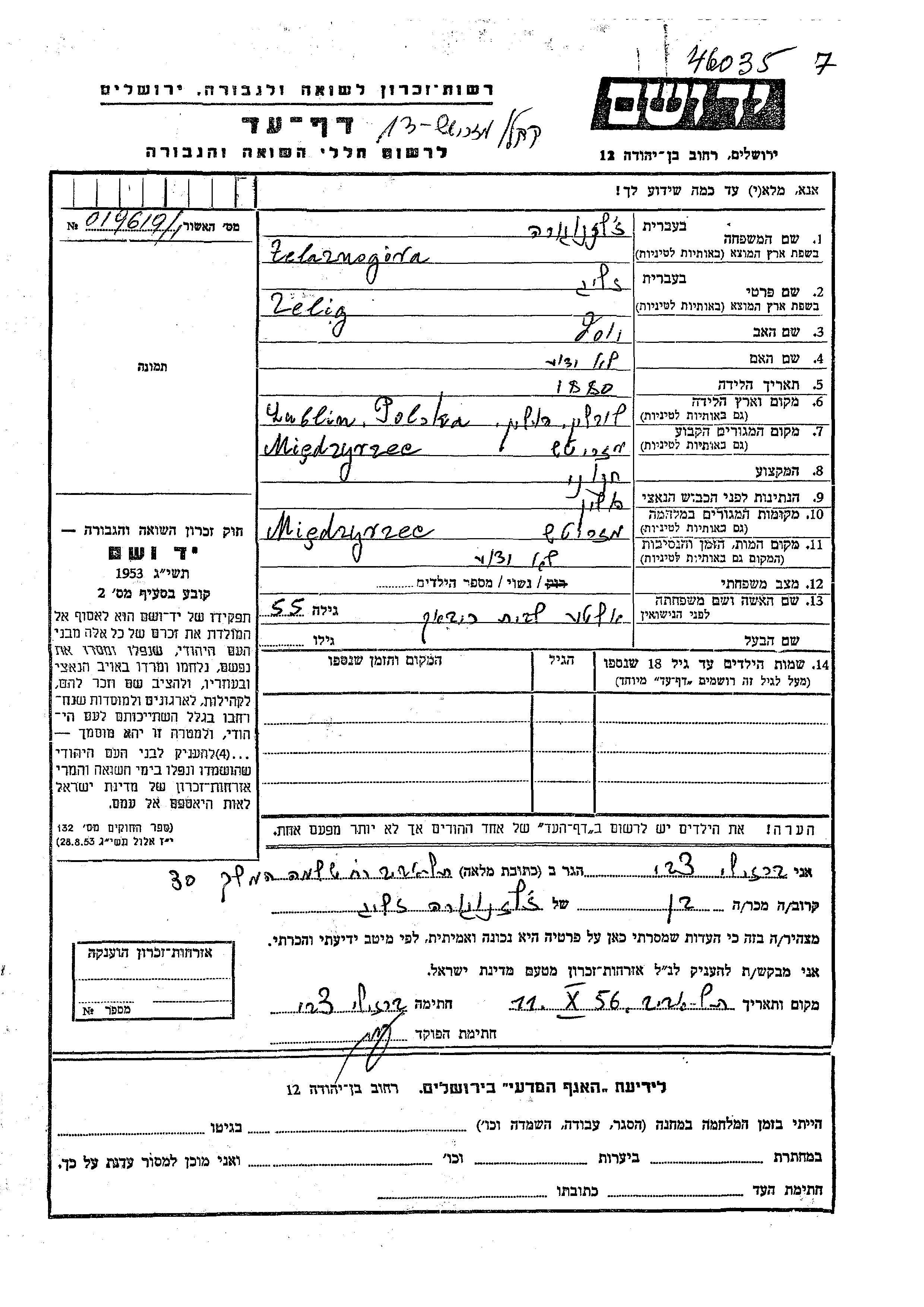 Zelaznogora Zelig 1880 Miedzyrzec, Pologne Feuille de témoignage
