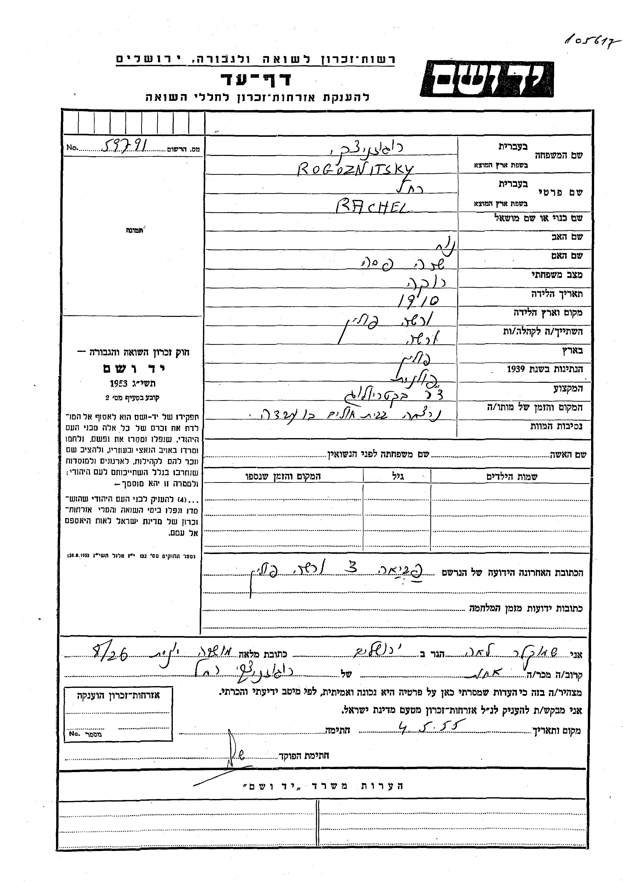Rogoznitsky Rachel 1910 Warszawa, Pologne Feuille de témoignage