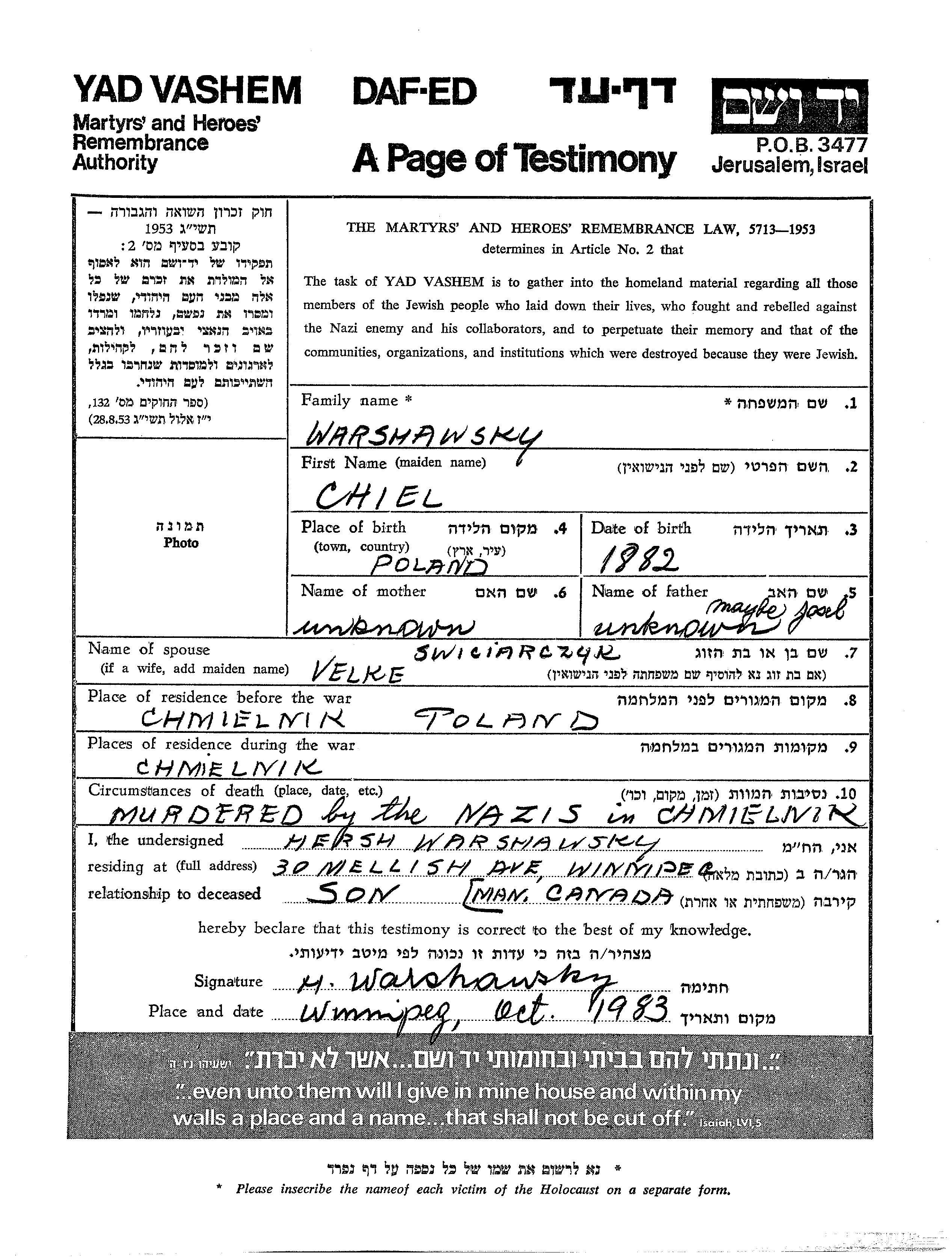 Chiel Warshawsky est né à Pologne en 1882. Il était Marié. Avant la seconde guerre mondiale il vivait à Chmielnik, Pologne. Au cours de la guerre, il était à Chmielnik, Pologne.