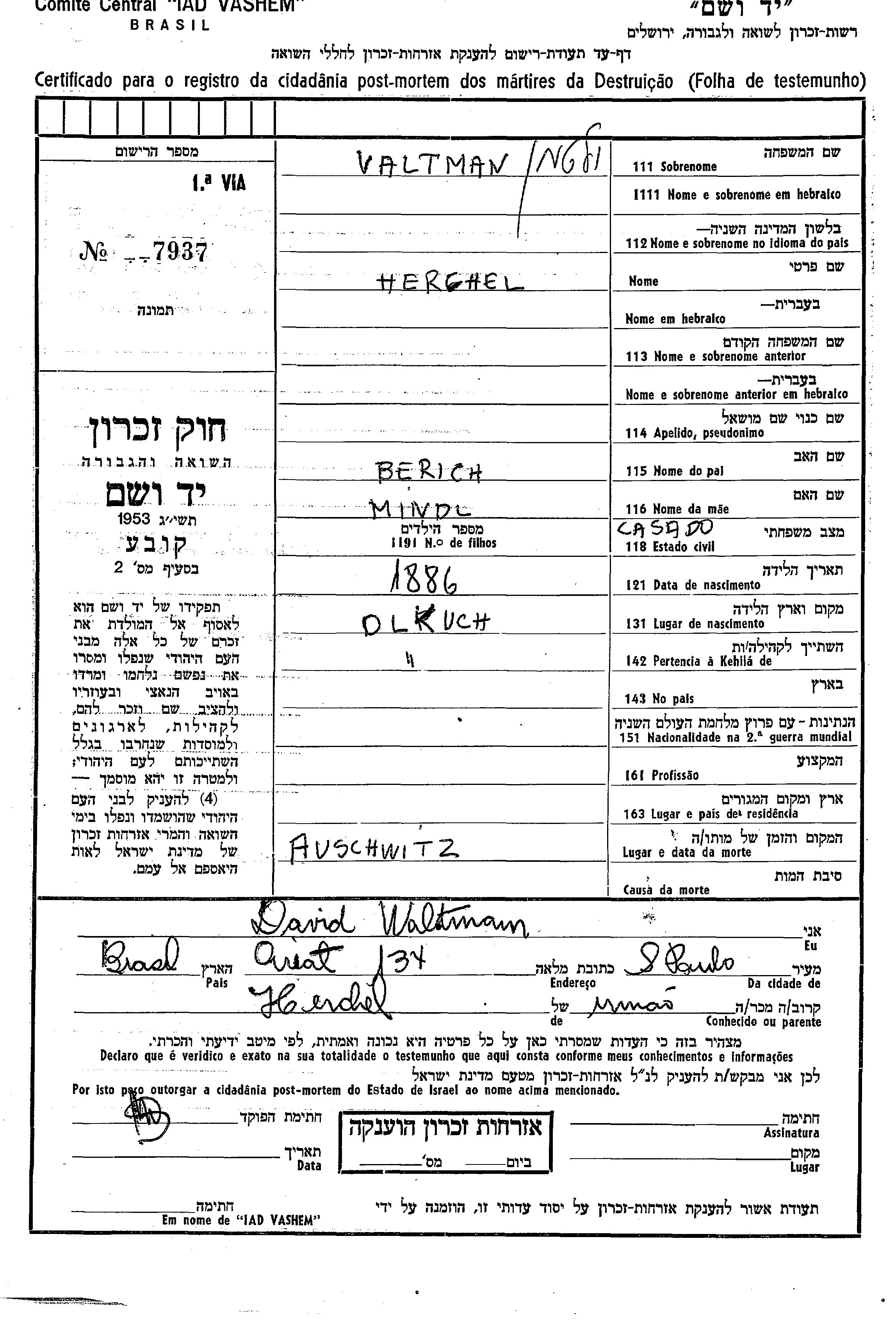 Valtman Herchel 1886 endroit inconnu, Feuille de témoignage
