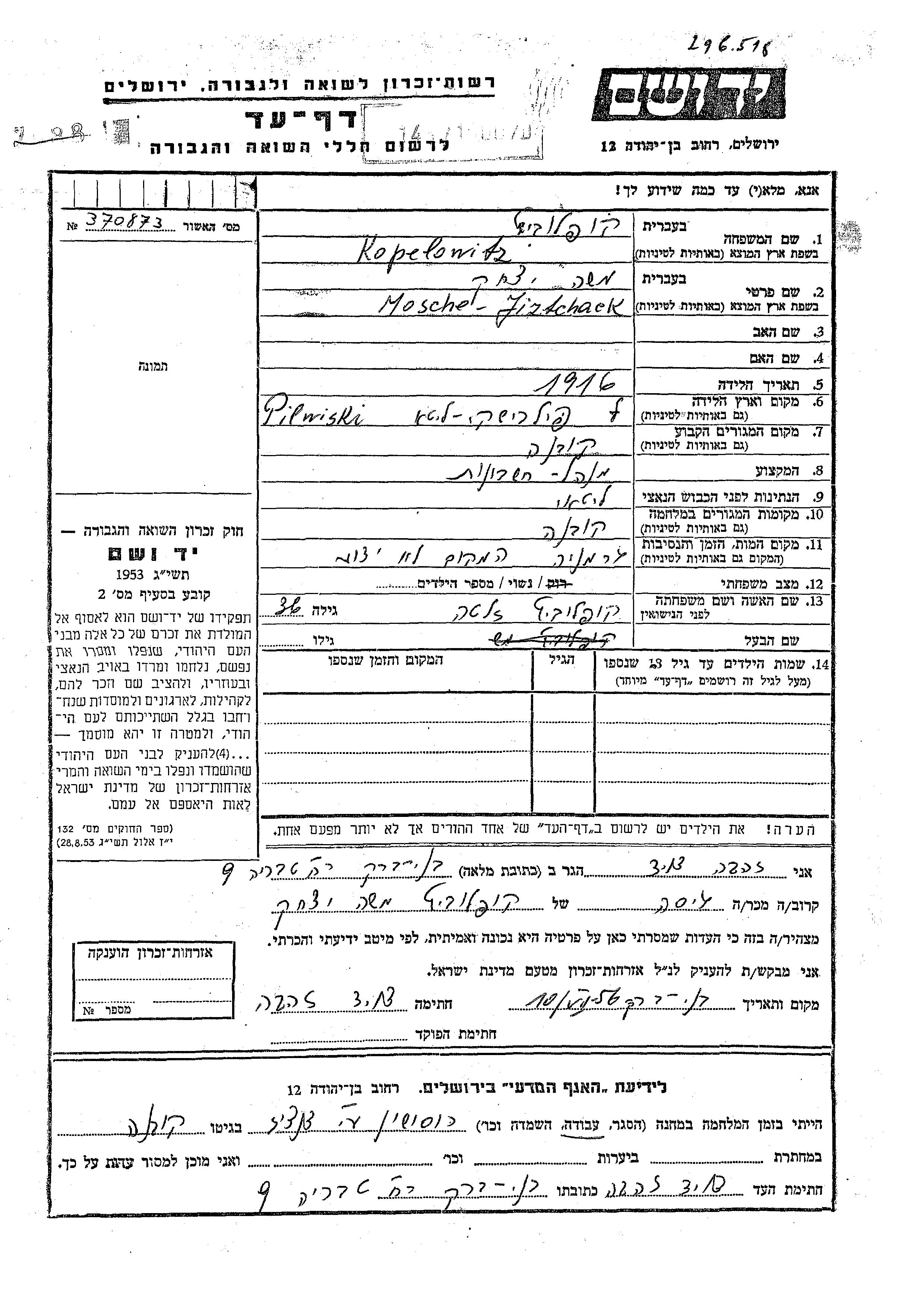 Kopelowitz Jiztchack Moshe 1916 Kowna, Lituanie Feuille de témoignage