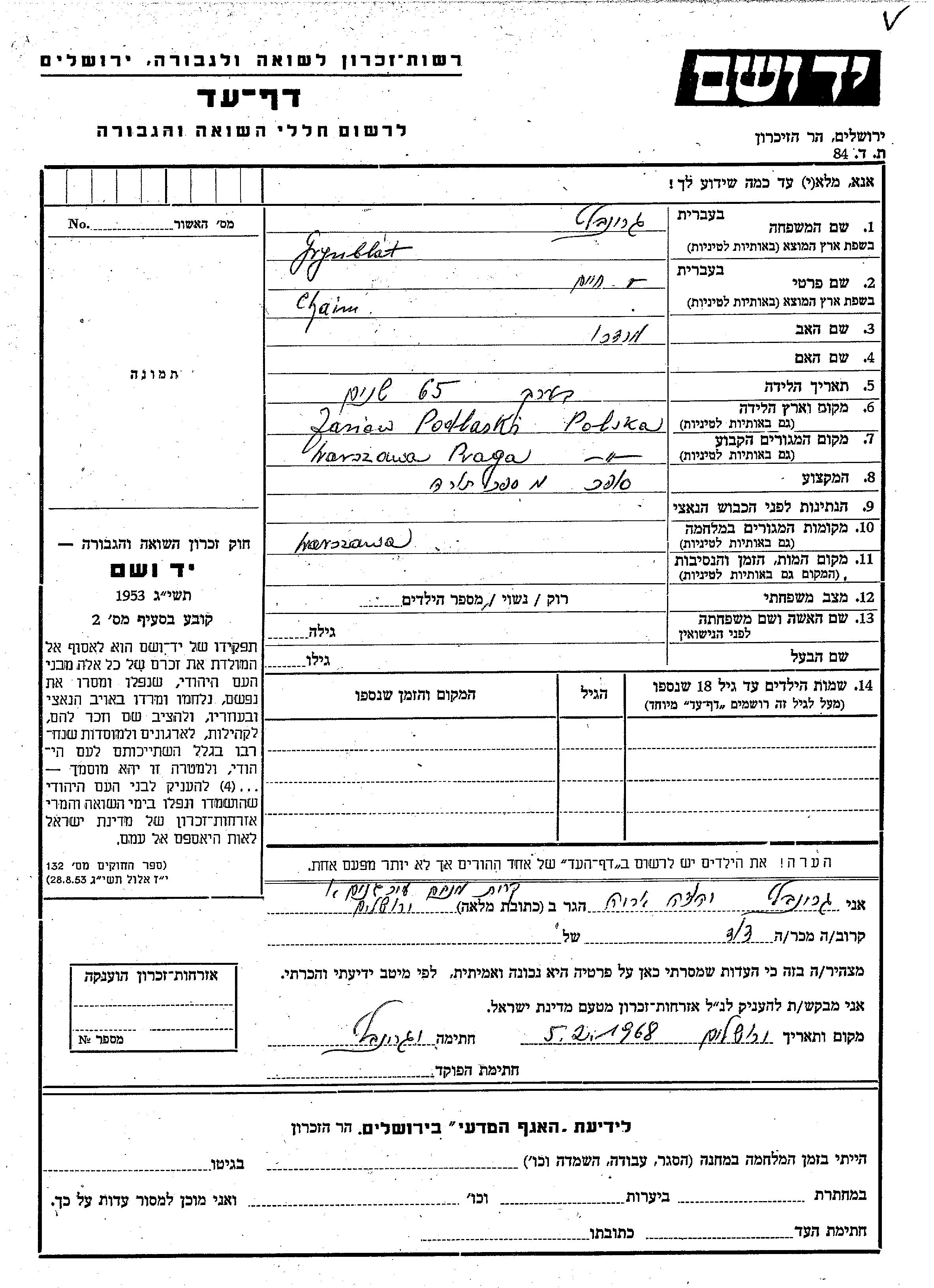 Chaim Grynblat est né à Janow Podlaski, Pologne, fils de Mordekhai. Il était Scribe de sefer torah. Avant la seconde guerre mondiale il vivait à Warsaw, Pologne. Au cours de la guerre, il était à Warsaw, Pologne.