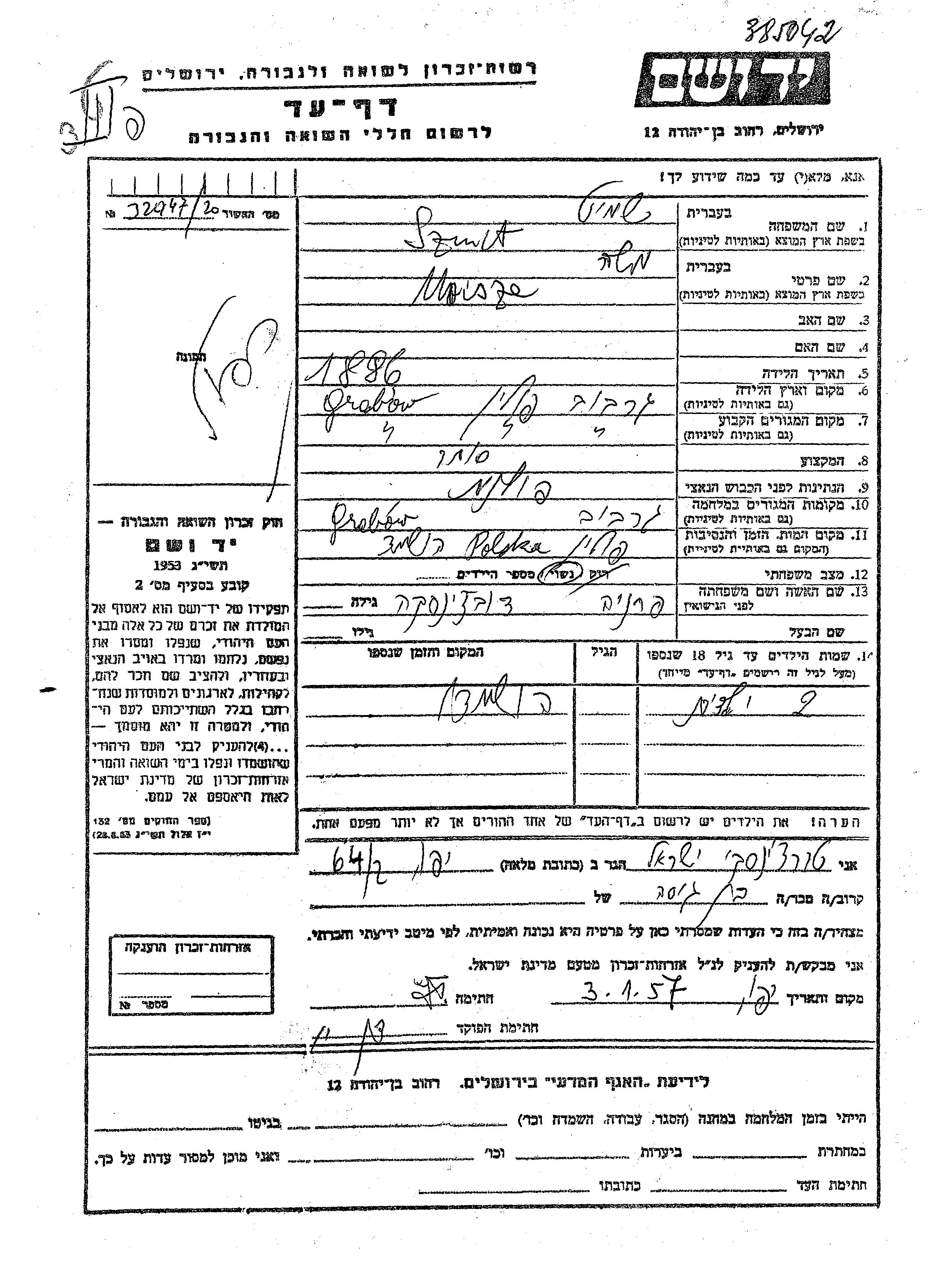 Szmit Moisze 1886 Grabow, Pologne Feuille de témoignage