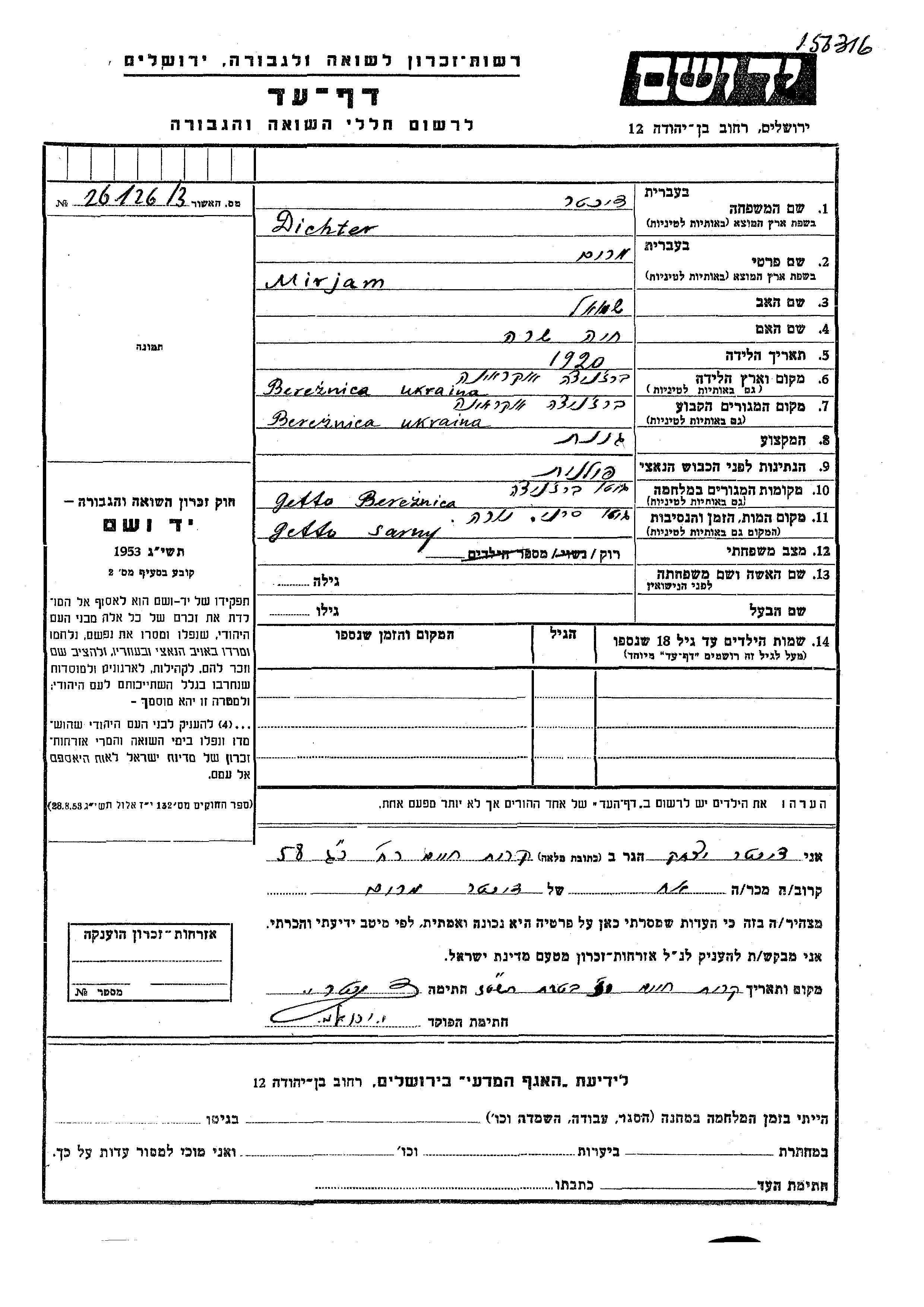 Dichter Mirjam 1920 Bereznica, Pologne Feuille de témoignage