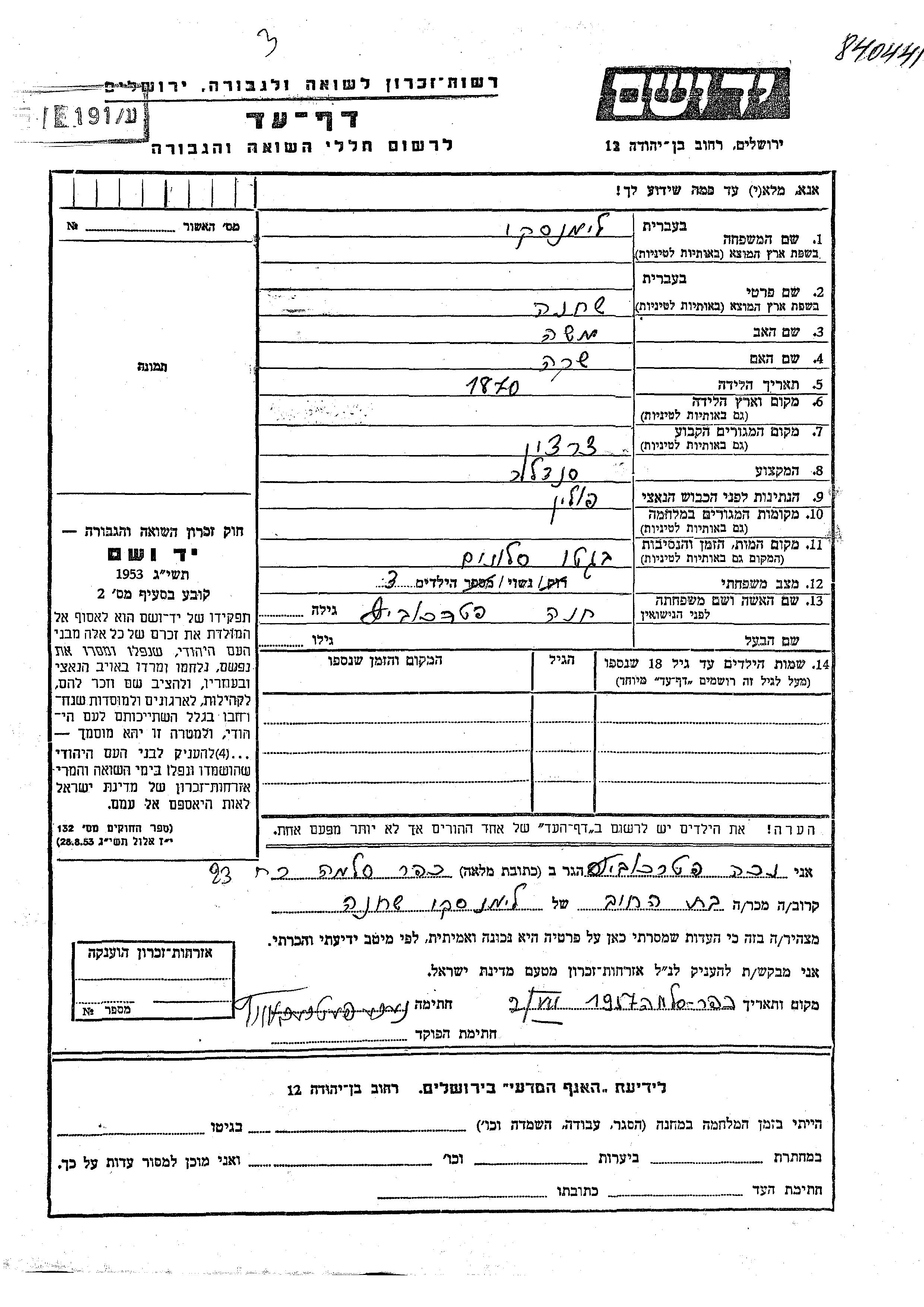 Limanski Shakhna 1870 endroit inconnu, Feuille de témoignage