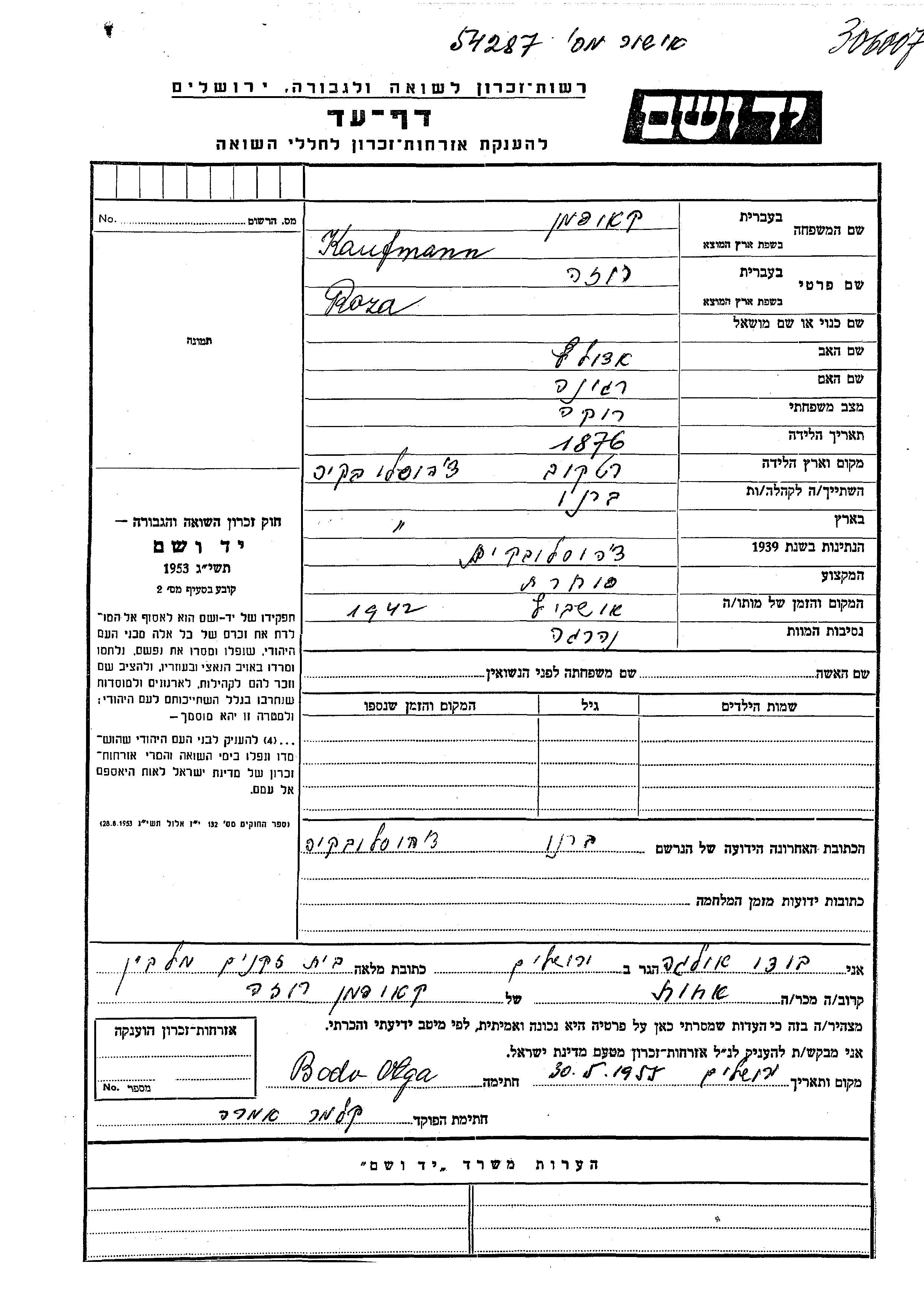 Kaufmann Roza 1876 Brno, Tchécoslovaquie Feuille de témoignage