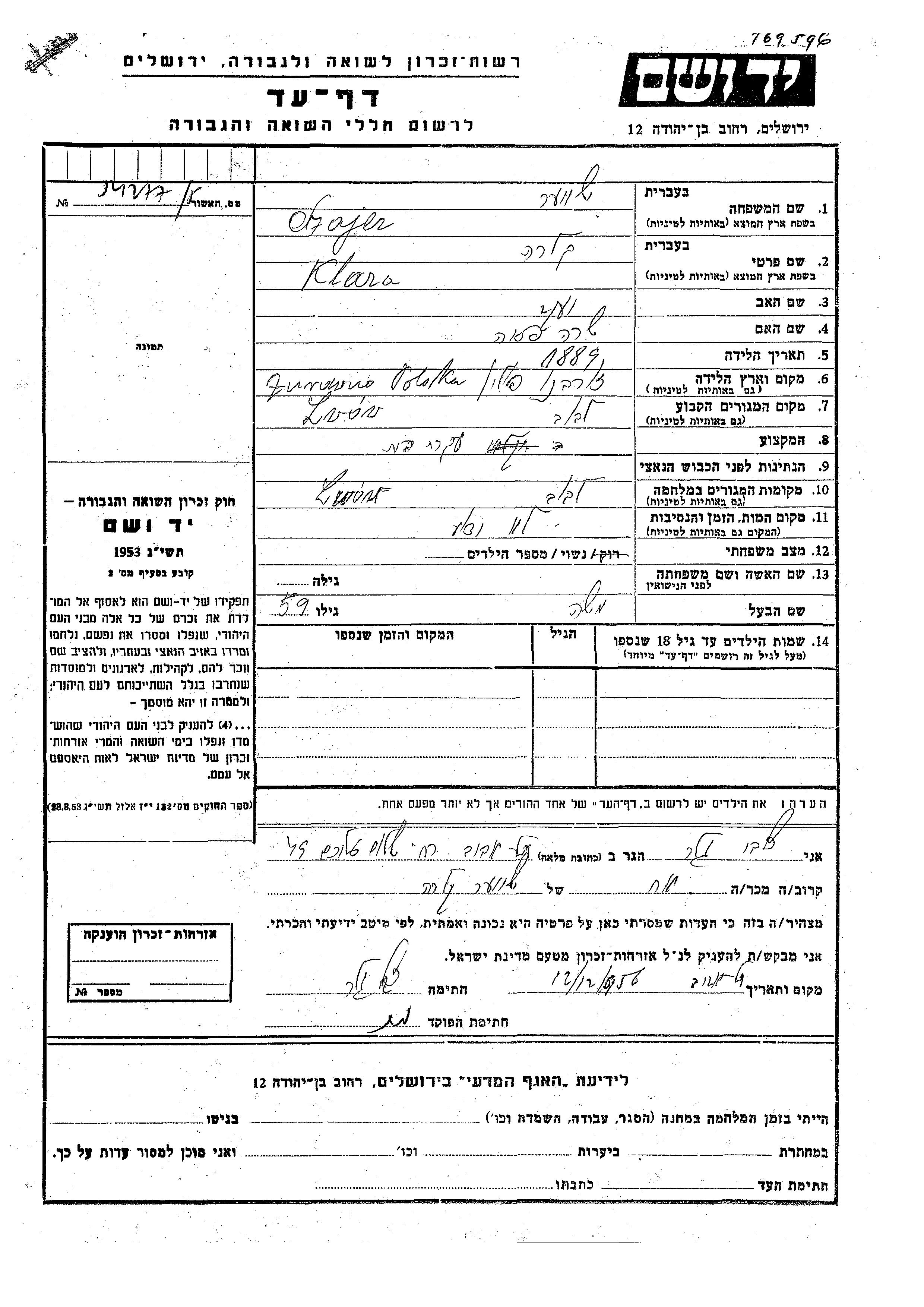 Szajer Shver Klara 1889 Lwow, Pologne Feuille de témoignage