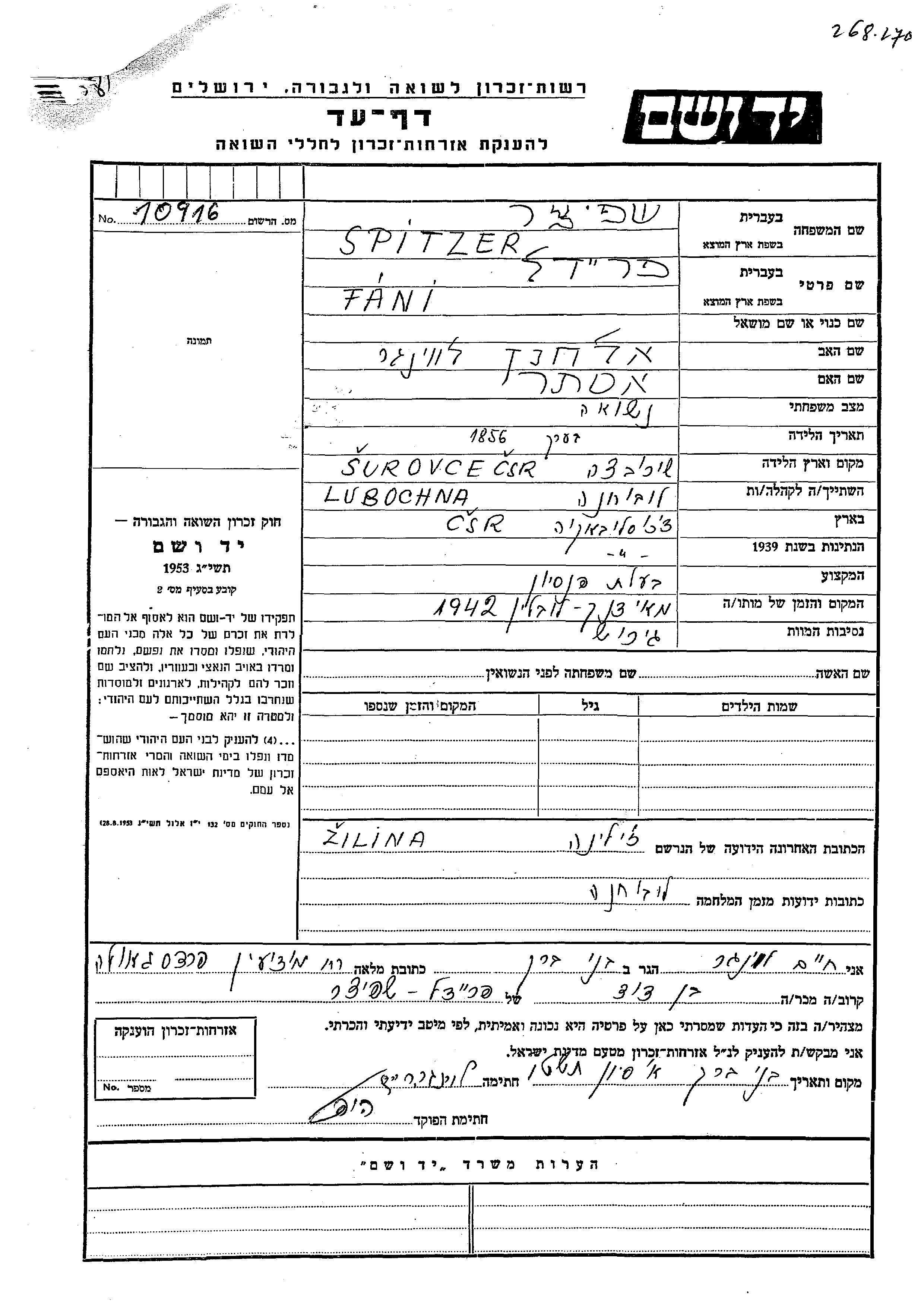 Spitzer Fani Freidel 1856 Lubochna, Tchécoslovaquie Feuille de témoignage