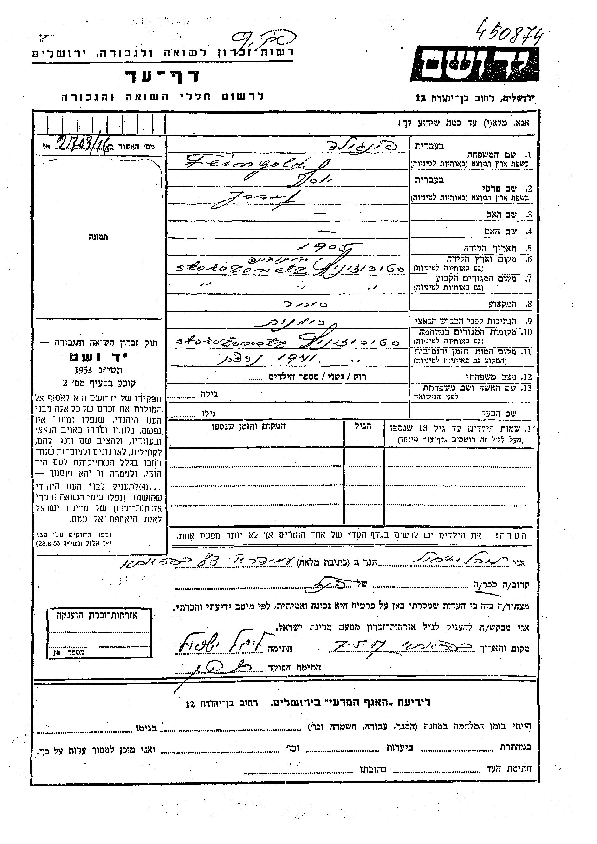 Feingold Josef 1905 Storozonetz, Roumanie Feuille de témoignage