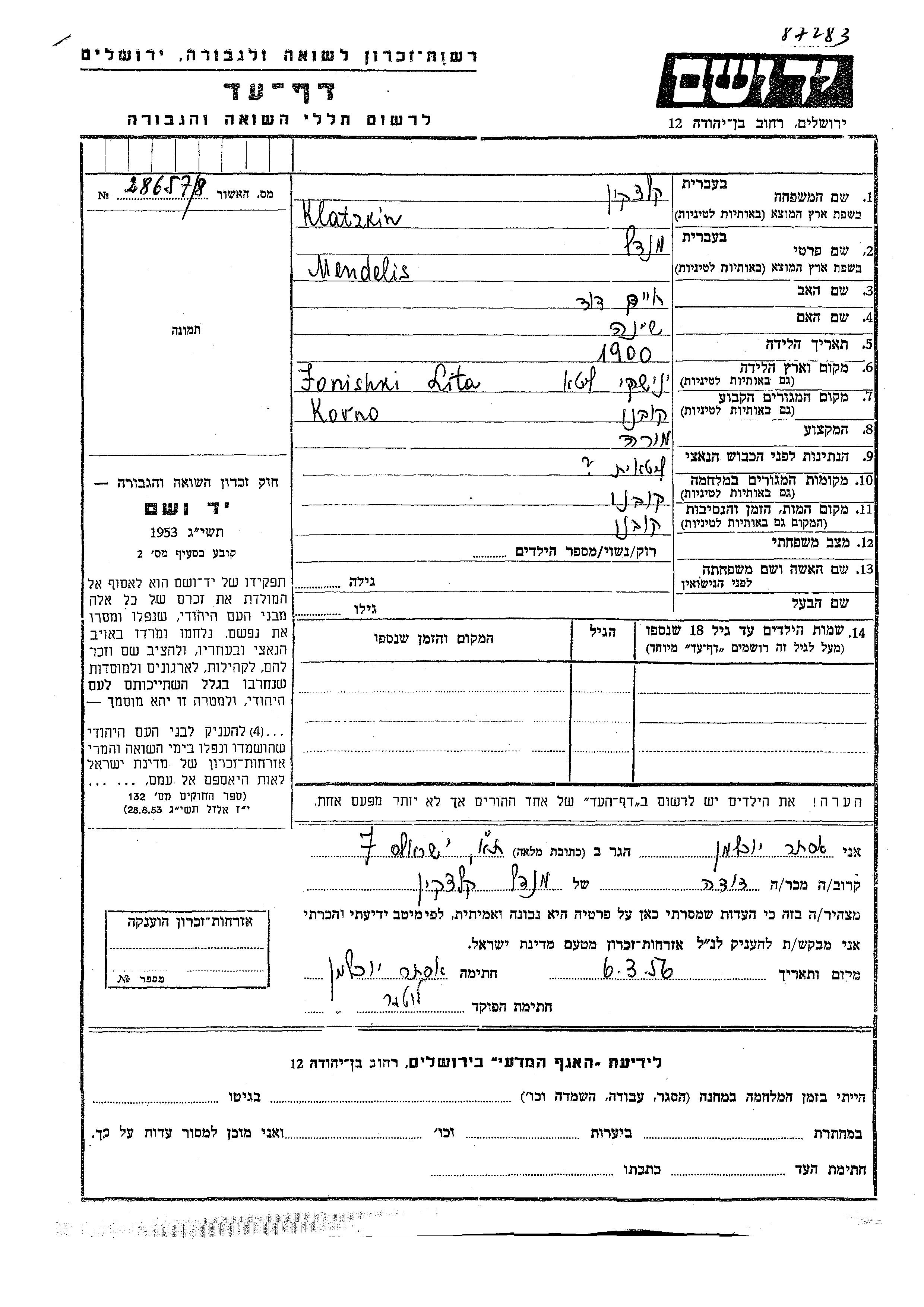 Klatzkin Mendelis 1900 Kovno, Lituanie Feuille de témoignage