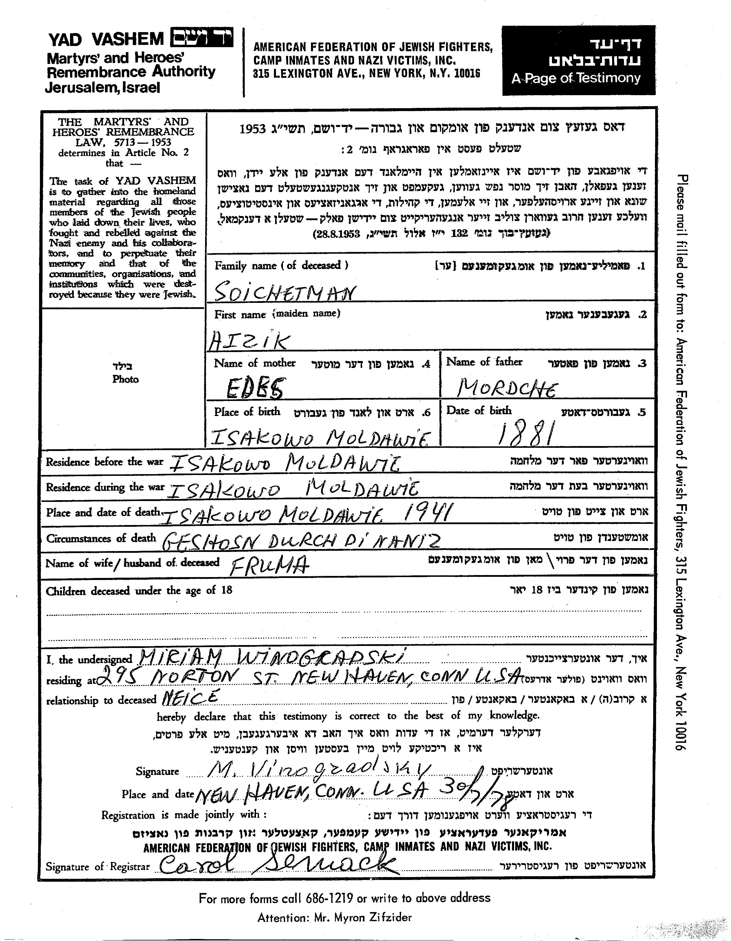 Aizik Soichetman est né à Isakowo, Roumanie en 1881, fils de Mordche et de Edes. Il était Mariée à Fruma. Avant la seconde guerre mondiale il vivait à Isakowo, Roumanie. Au cours de la guerre, il était à Isakowo, Roumanie.