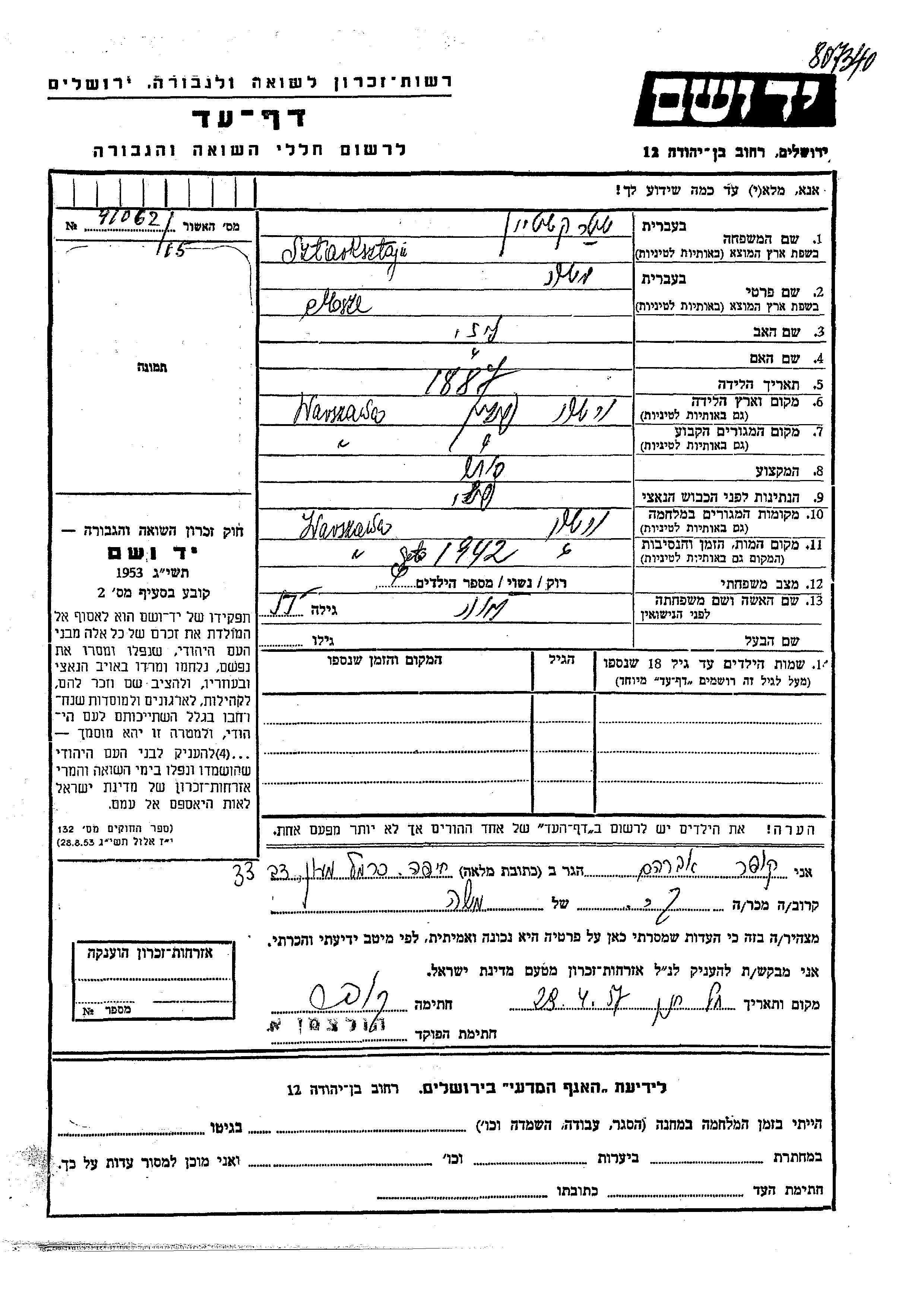 Sztarksztajn Mosze 1887 Warsaw, Pologne Feuille de témoignage