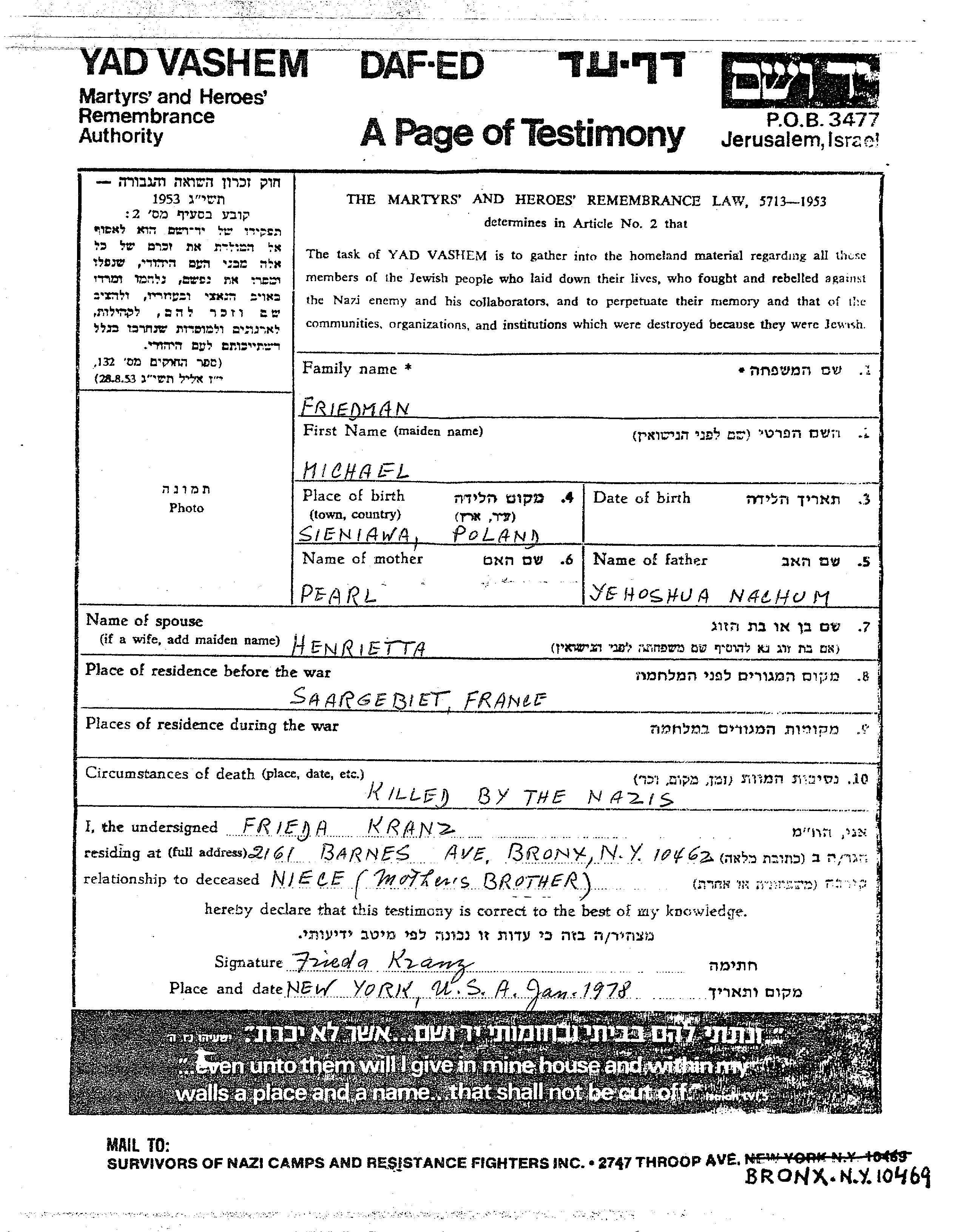 Michael Friedman est né fils de Yehoshua Nachom et de Pearl. Il était Mariée à Henrietta. Avant la seconde guerre mondiale il vivait à Saar, Allemagne. Au cours de la guerre, il était à Saar, Allemagne.