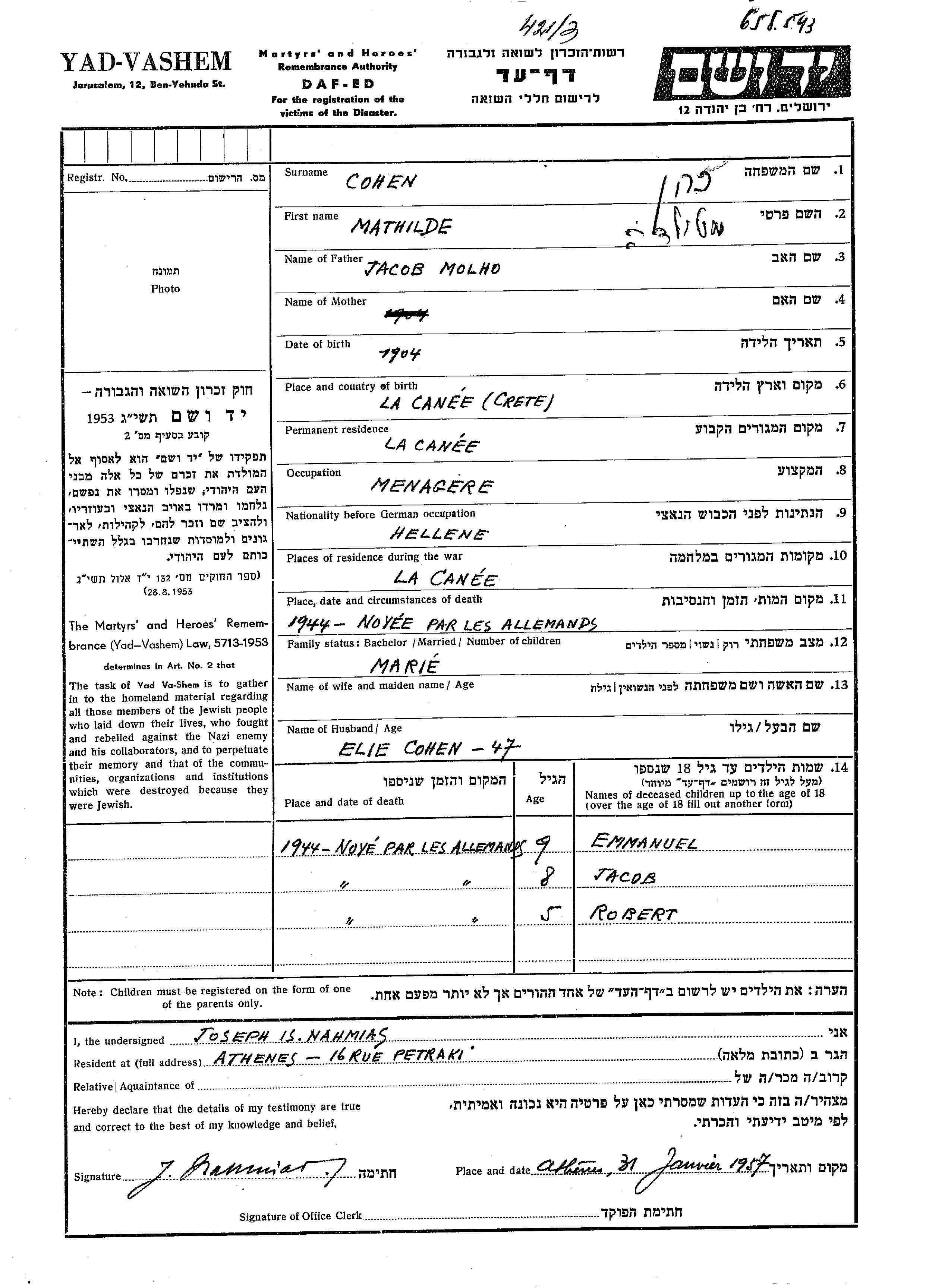 Mathilde Cohn née Molho est née à La Canee, Grèce en 1904, fille de Jacob. Elle était Ménagère et Mariée à Elie. Avant la seconde guerre mondiale elle vivait à La Canee, Grèce. Pendant la guerre, elle était à La Canee, Grèce.