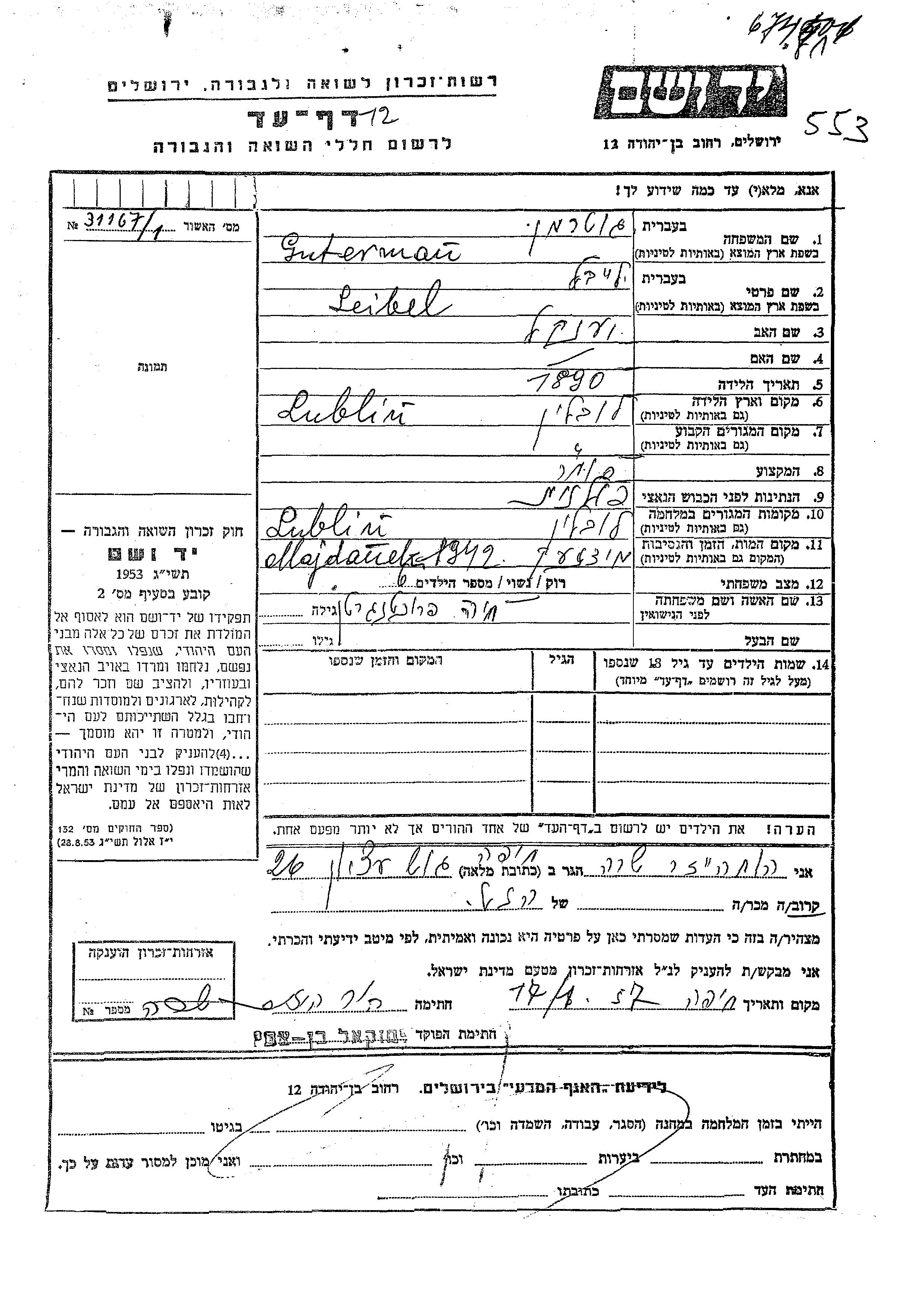 Guterman Leibel 1890 Lublin, Pologne Feuille de témoignage