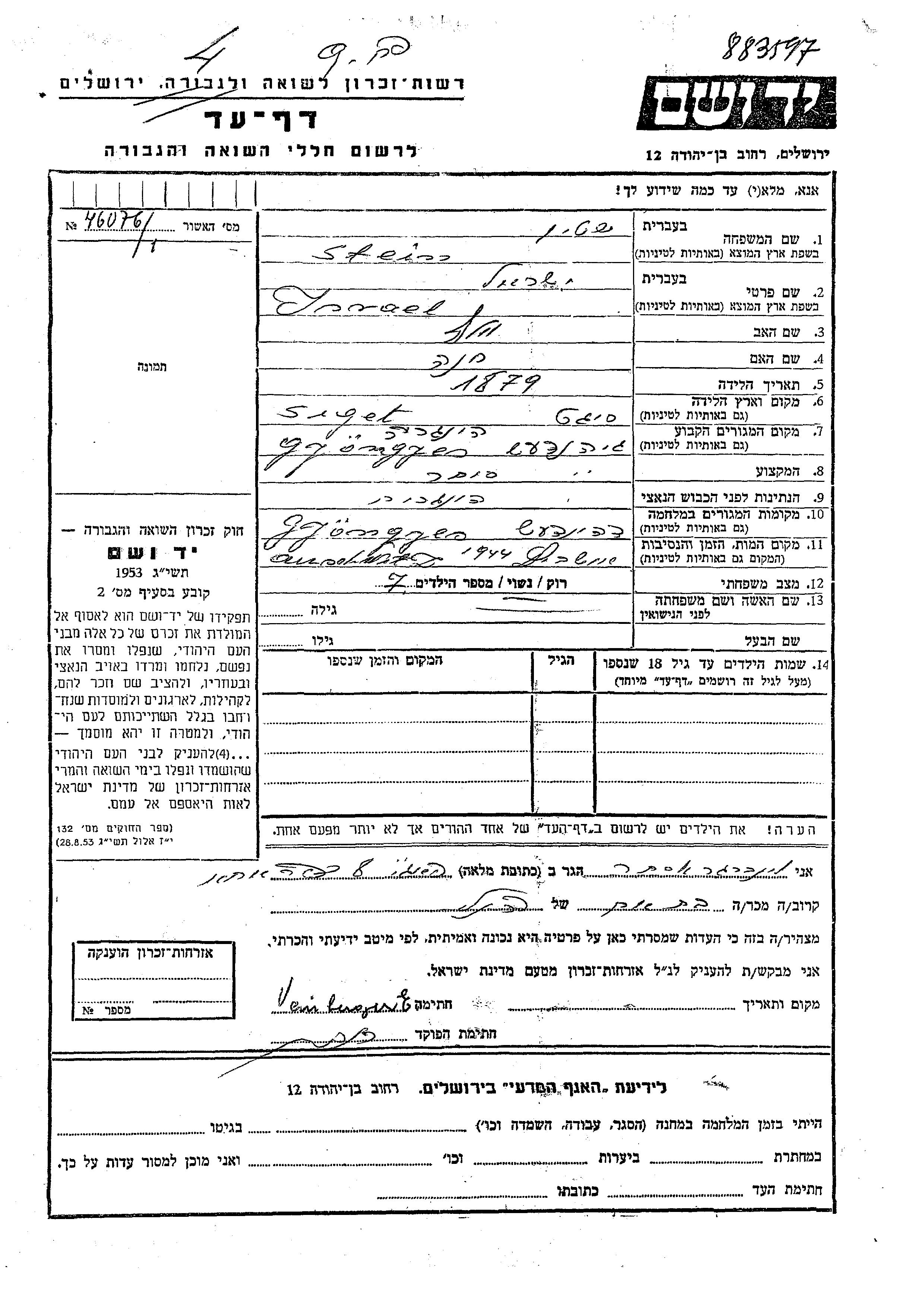 Yad Vashem - Pages of Testimony Names Memorial Collection