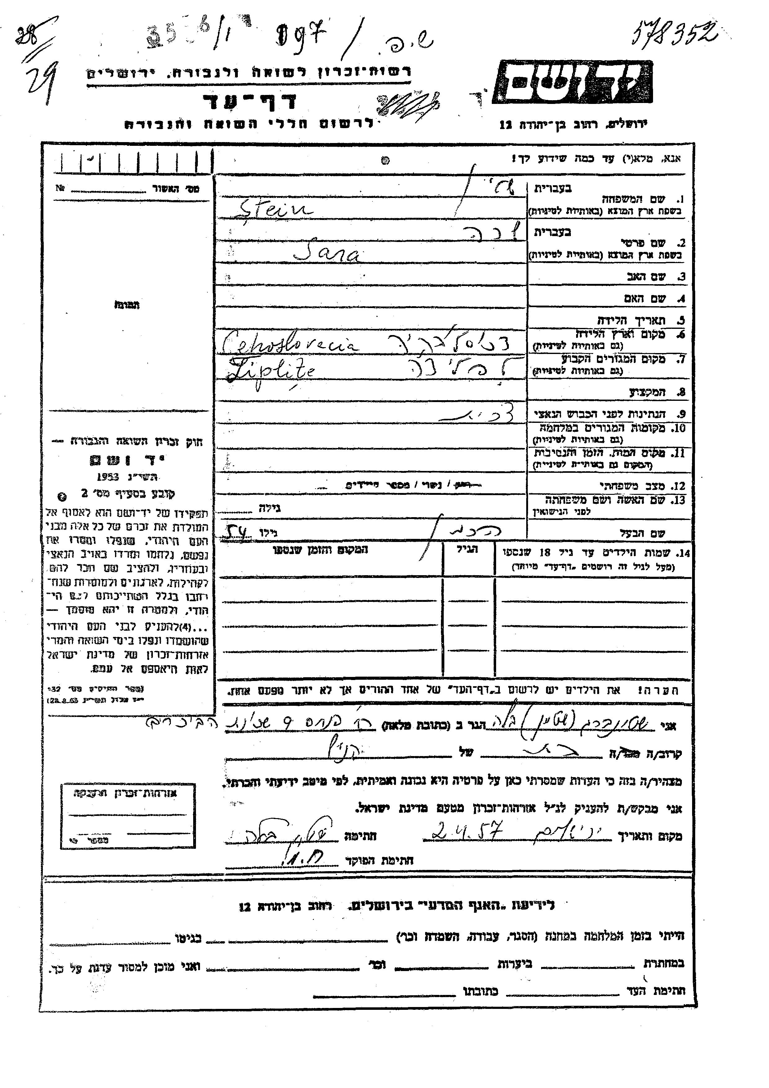 Stein Sara Liplite, Feuille de témoignage
