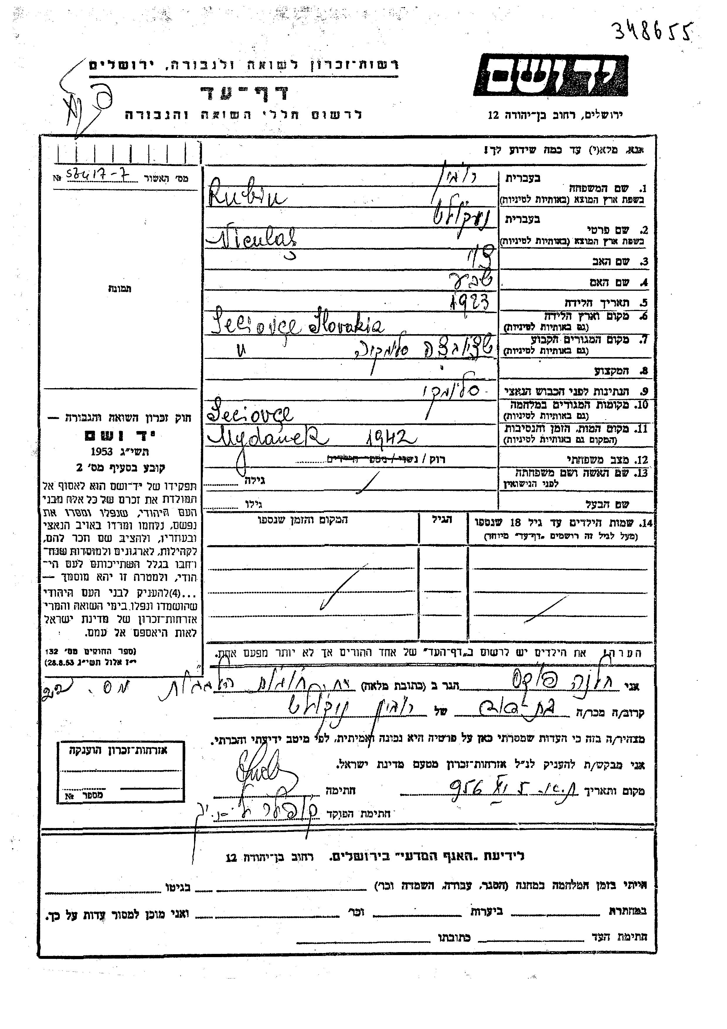 Rubin Nicolas 1923 Seciovce, Tchécoslovaquie Feuille de témoignage