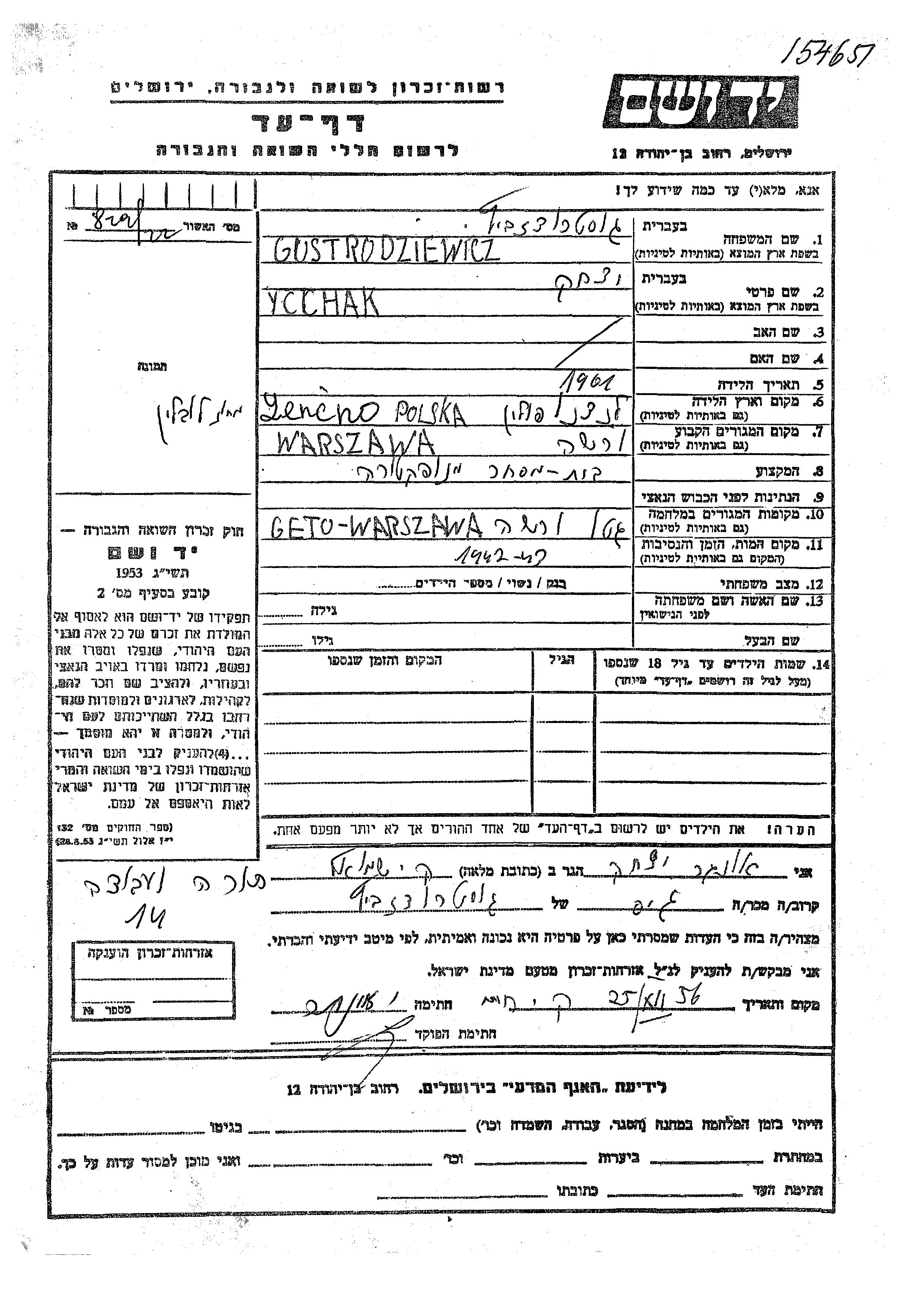 Gustrodziewicz Ycchak 1901 Warszawa, Pologne Feuille de témoignage
