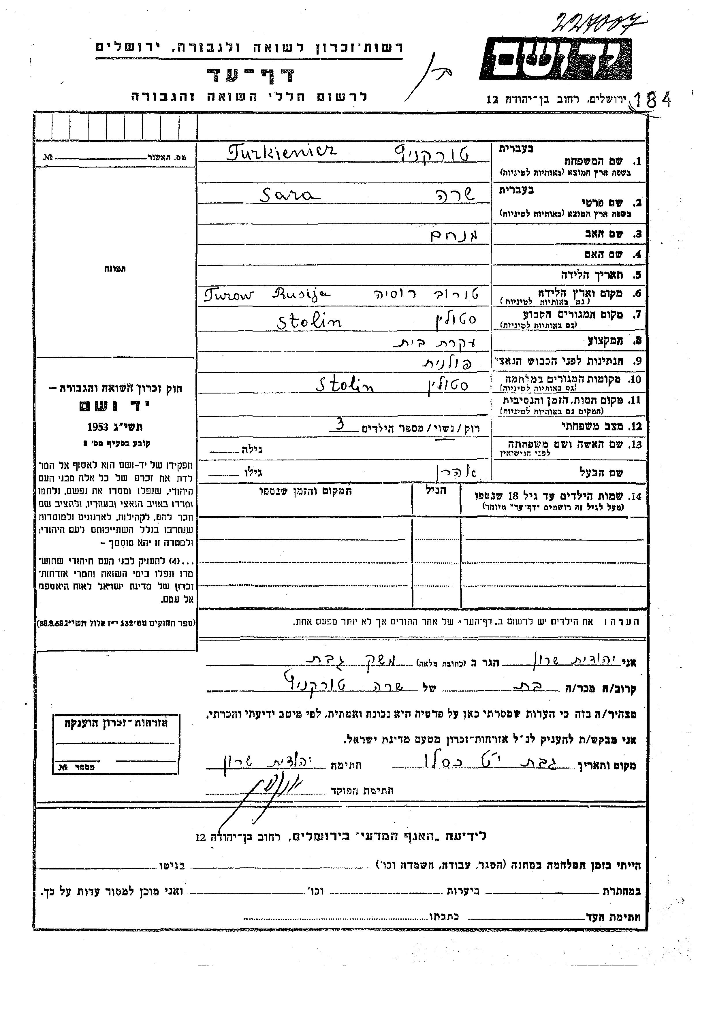 Sara Turkienicz est née à Turow, Pologne, fille de Menakhem. Elle était Femme au foyer et Mariée à Aharon. Avant la seconde guerre mondiale elle vivait à Stolin, Pologne. Pendant la guerre, elle était à Stolin, Pologne.