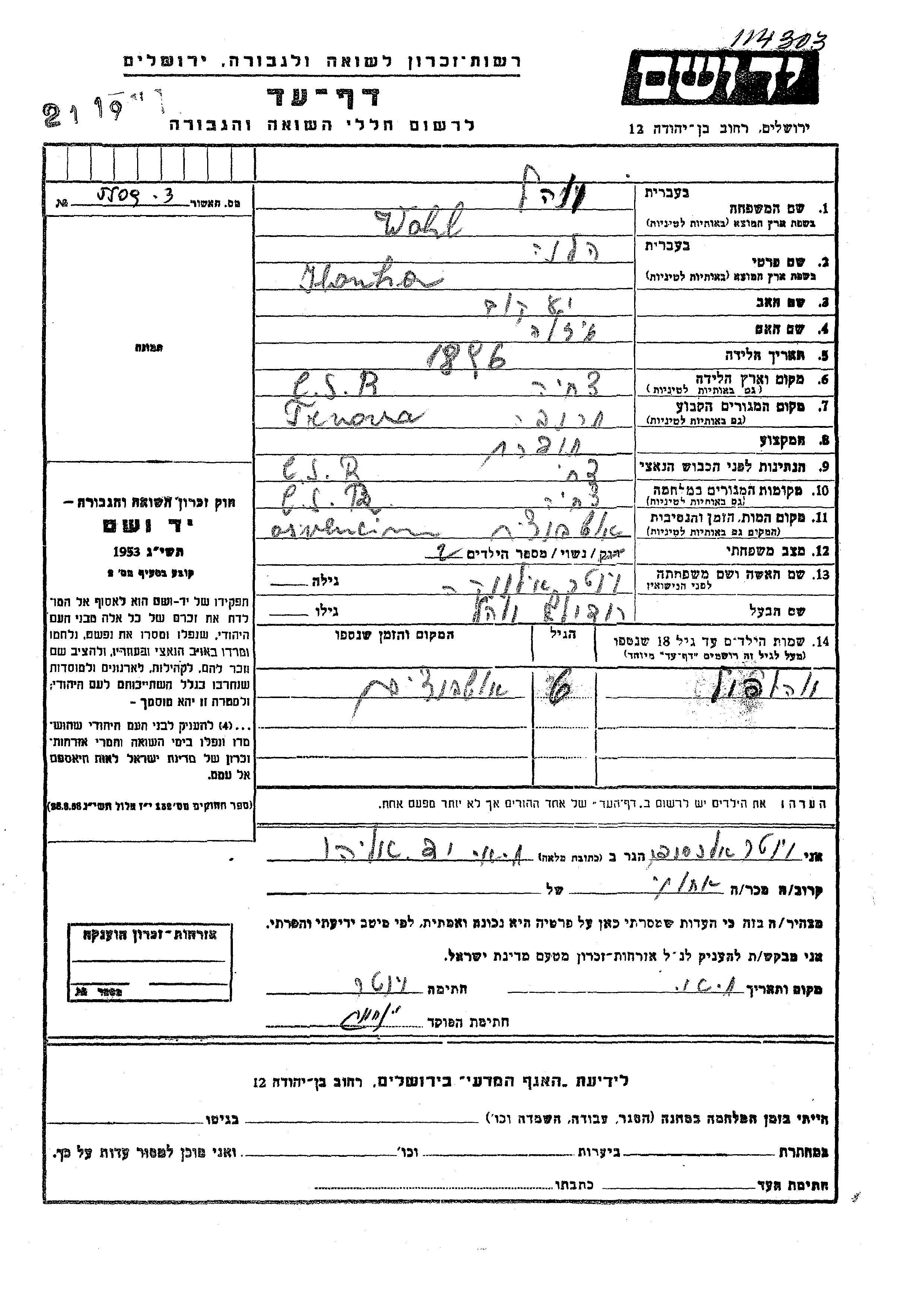 Wahl Vol Hanha Helena Ilana 1896 Trnovany, Tchécoslovaquie Feuille de témoignage